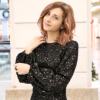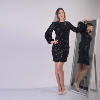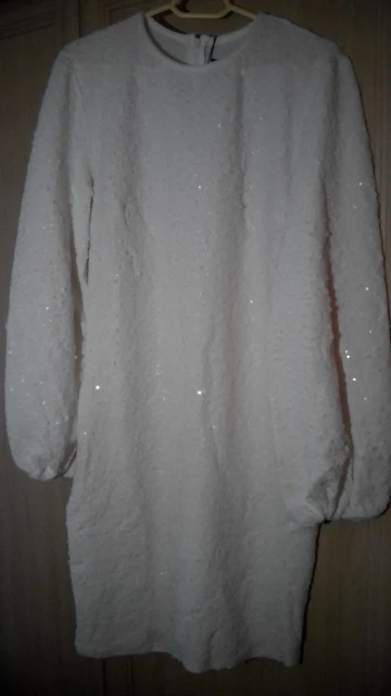 Material-60% cotton, the rest of synthetics. The fabric does not crumple at all. Sewing is good, the lines are neat and smooth. However, lining fabric in the dress is not-the reverse side is all pierced with seams from sequins. When you put on, the dress is a little pricked, but not critical, and after you get used to it and do not pay attention. Model fitted. Sleeves-lanterns: fixed with an elastic band on the wrists. Behind the dress is sewn a secret zipper, but personally i did not need it. The material stretches very well, so i do not touch the zipper at all. Yes, and it works well in that case, if during unfastening/fastening sequins do not fall into the lock, and they love this case, because as close as possible sewn to the lock. at its 90-65-92 i chose m-ku and the dress village is amazing. Sleeves fit, and shoulders in place. The length is optimal. Dress measurements: Length-90 cm. Shoulder width-39 cm. Ctd-44 cm. Sweat-36 cm. Pob-45 cm. The length of the sleeve is 57 cm. The length of the sleeve along the inner seam is 45 cm.
