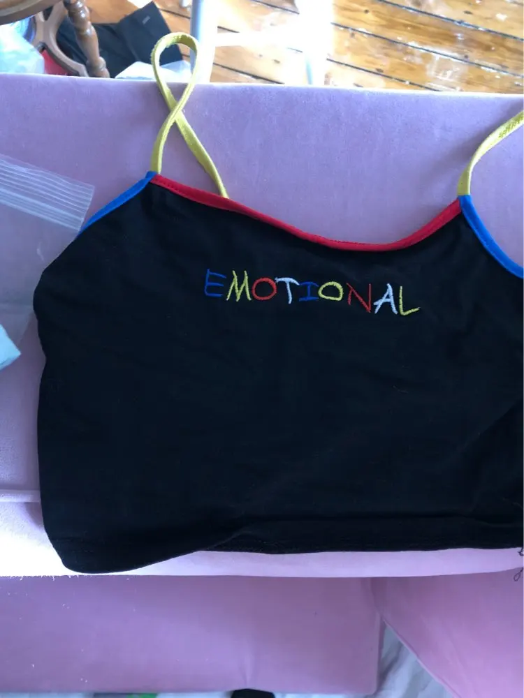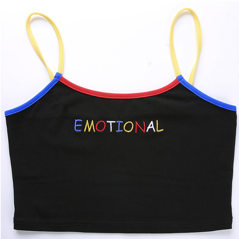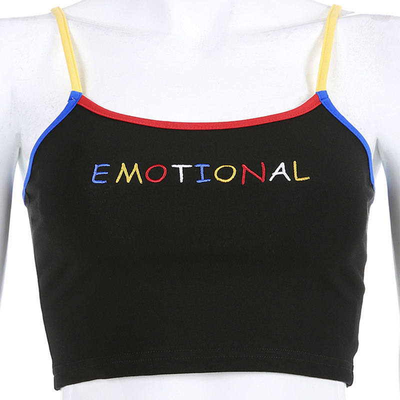 EMOTIONAL Letter Embroidery Cropped Spaghetti Strap Tank Tops JKP3795