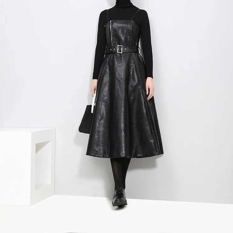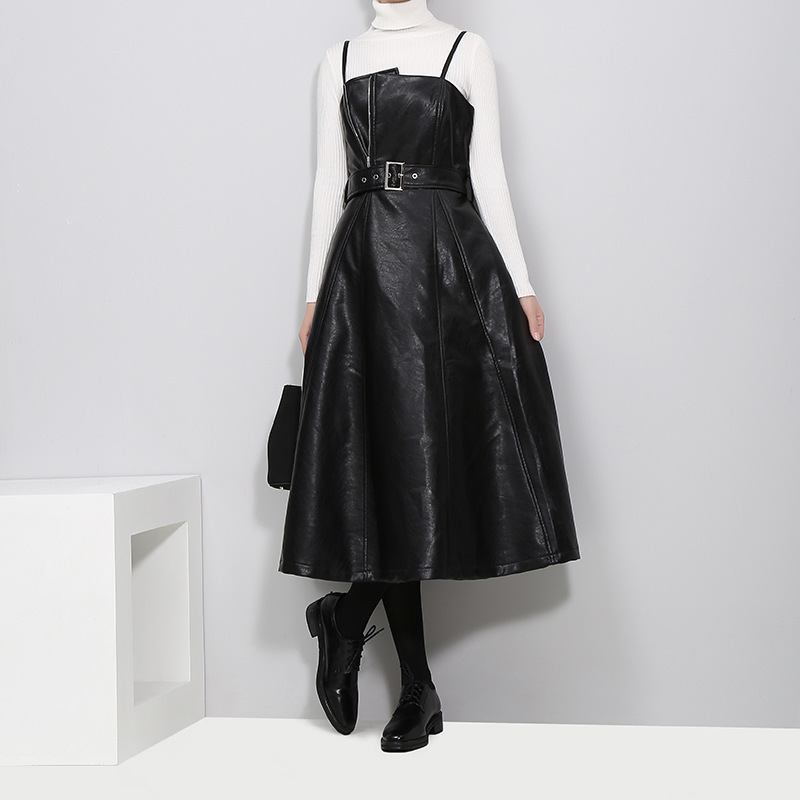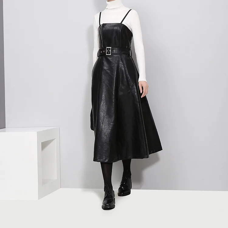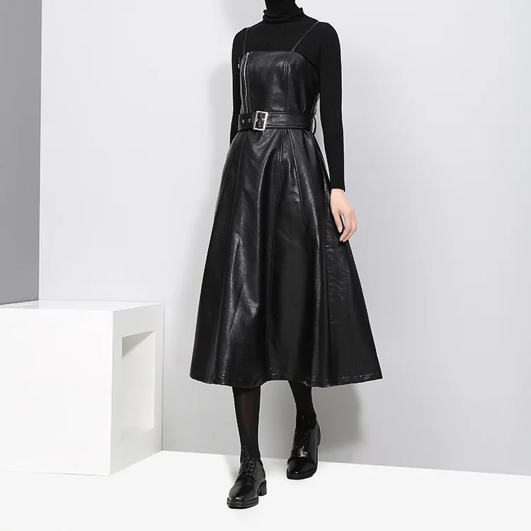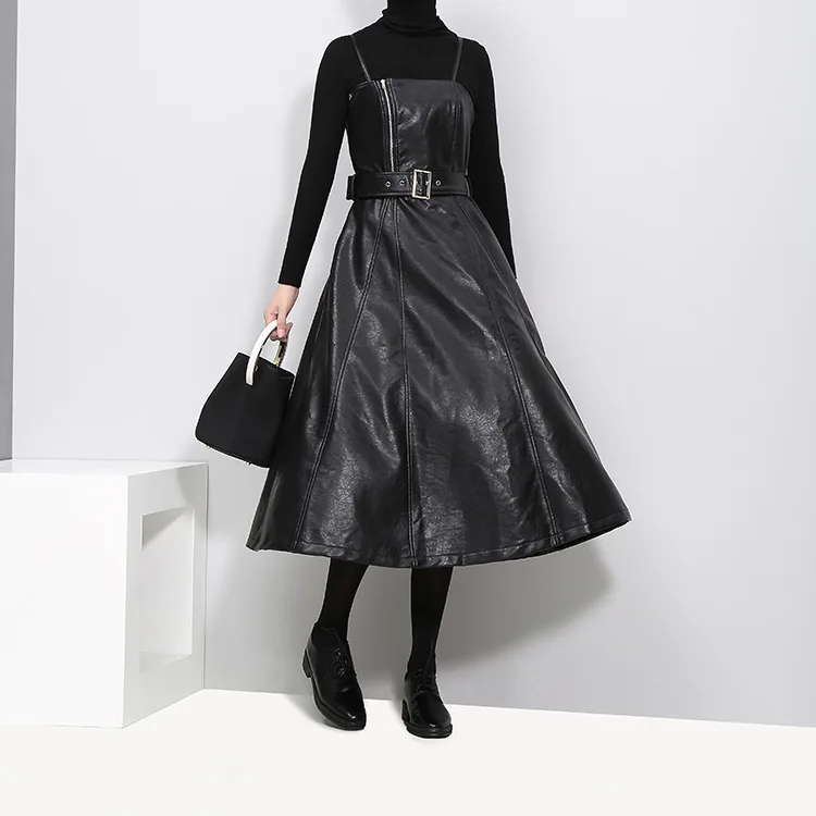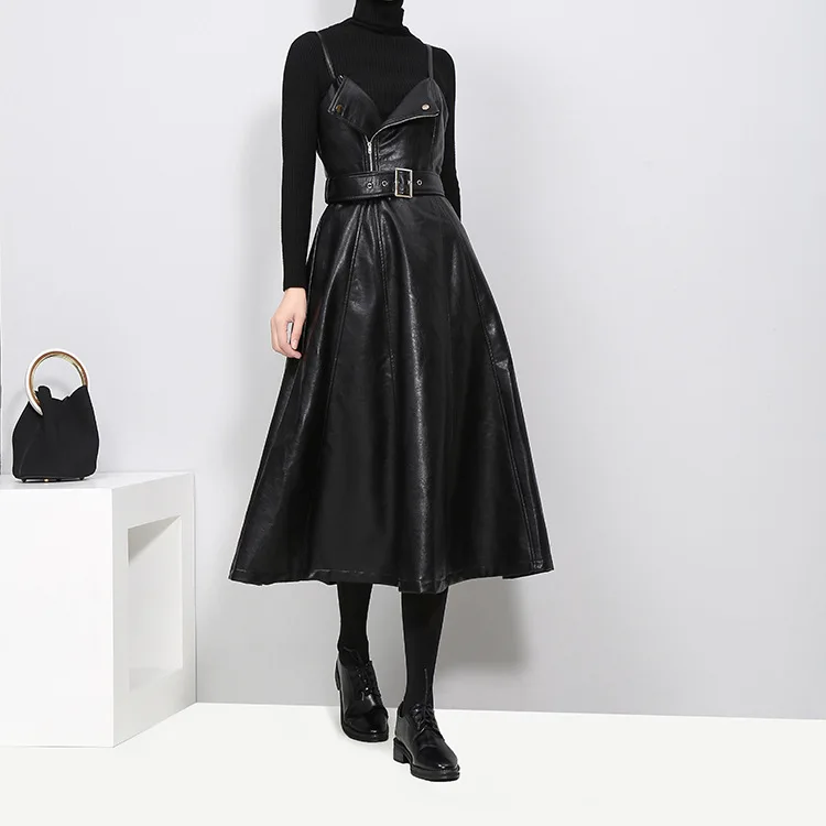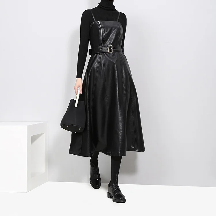 2020 New Spring Autumn Solid Color Strapless Black PU Leather High Waist Belt Zipper Loose Dress JKP3877