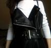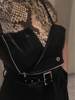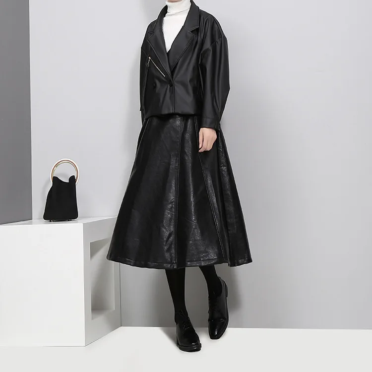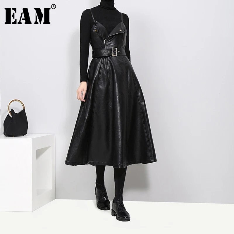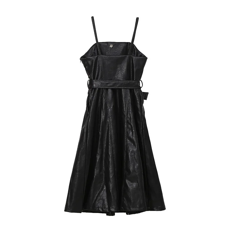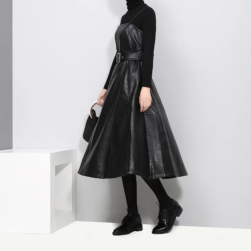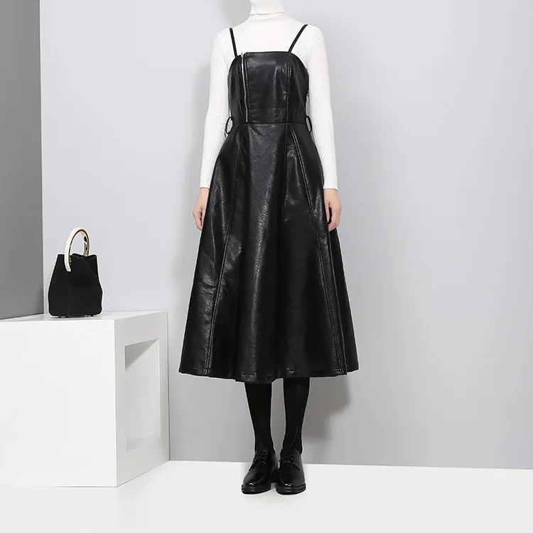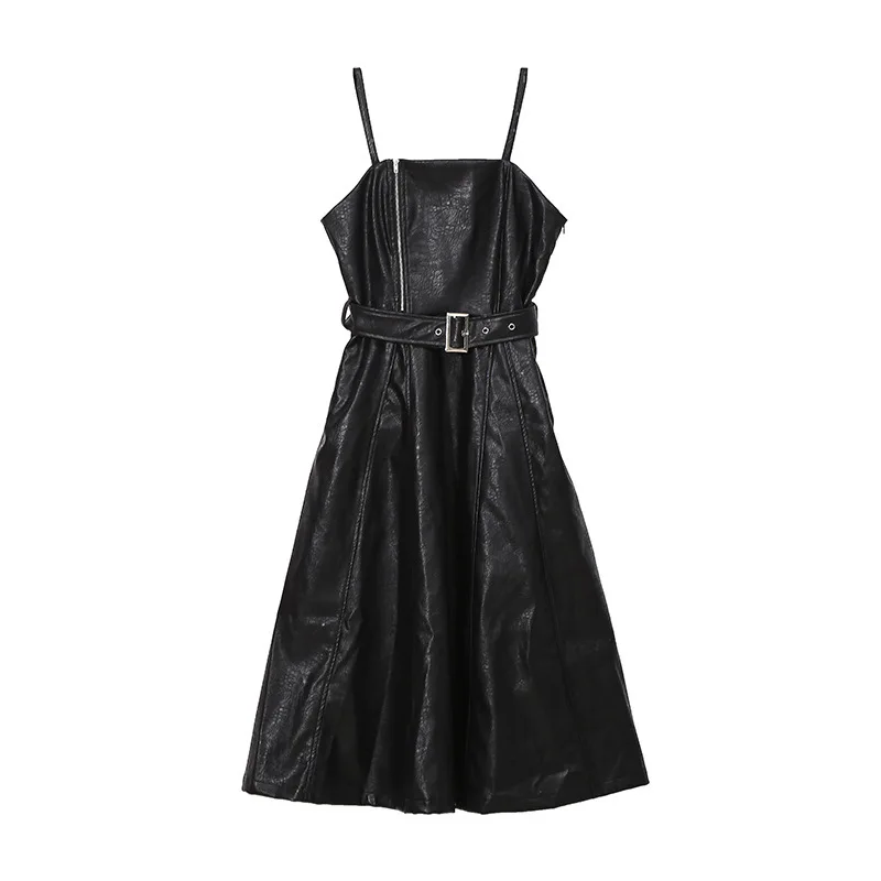 2020 New Spring Autumn Solid Color Strapless Black PU Leather High Waist Belt Zipper Loose Dress JKP3877
