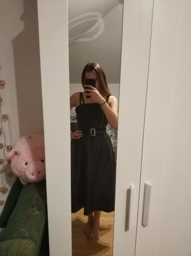 The dress looks exactly like on pictures. Fabric is nice, it doesn't look cheap. It smells a little. Size is just like discribed. I bought it 11.11, delivered 20.11