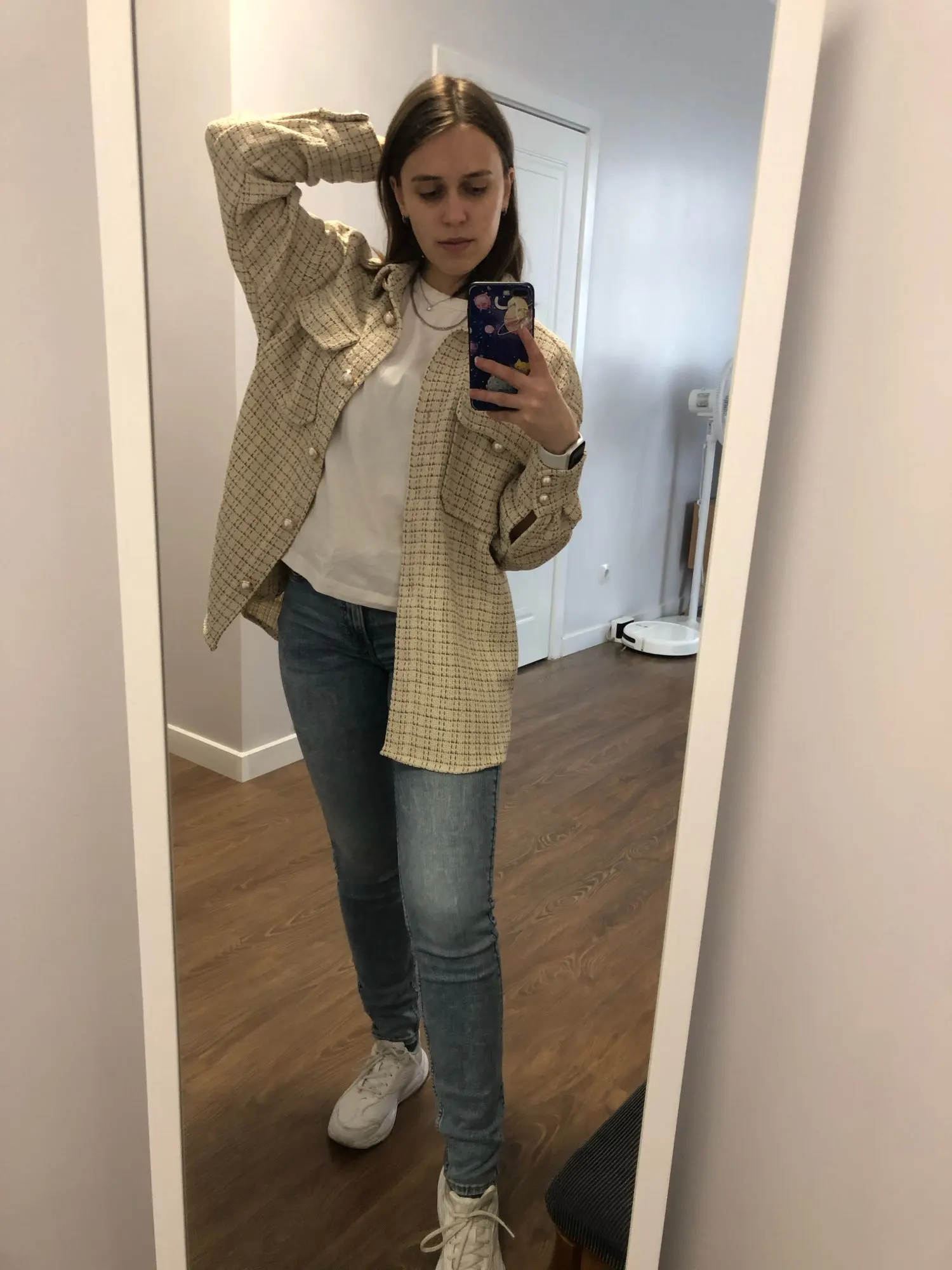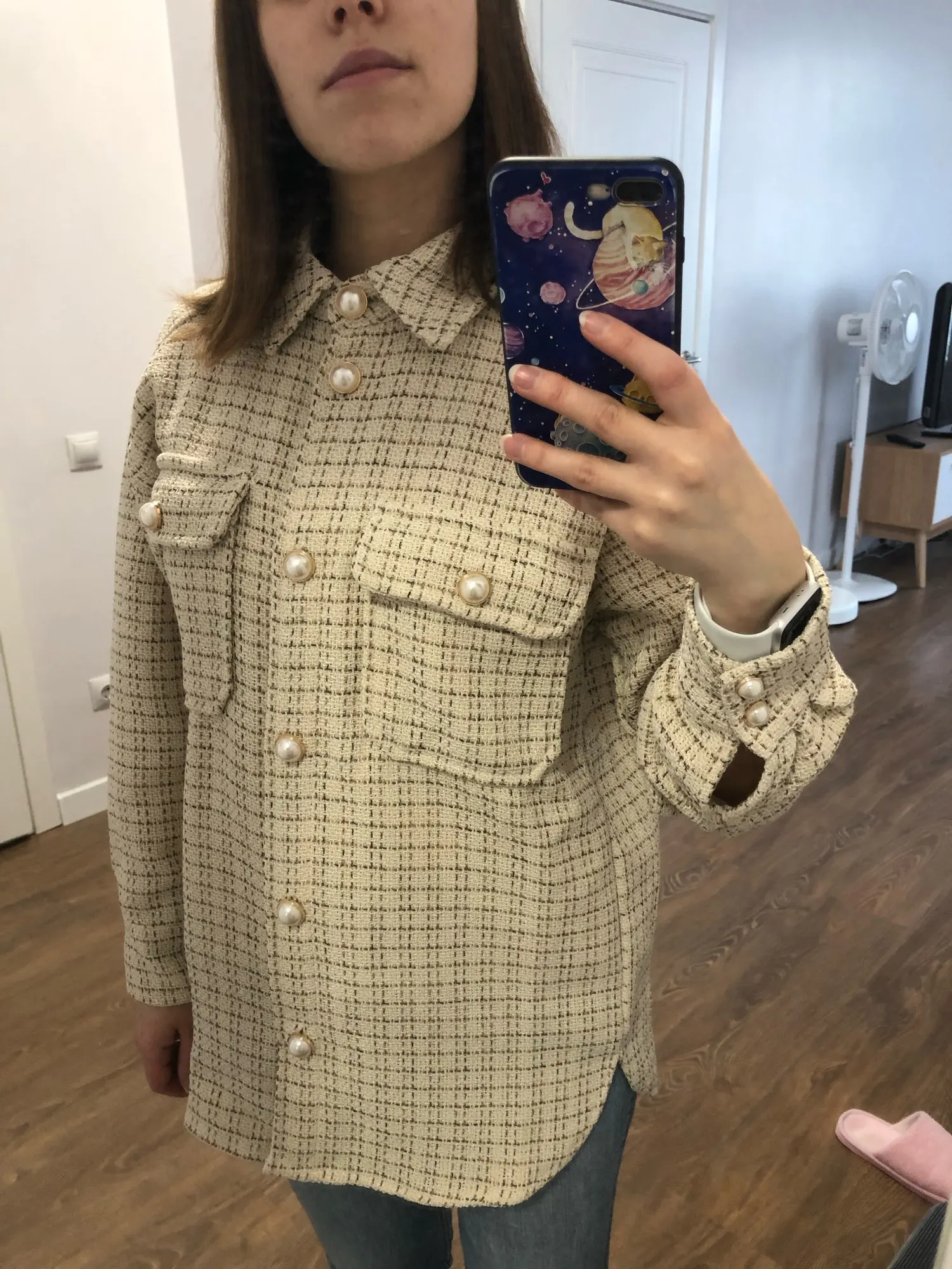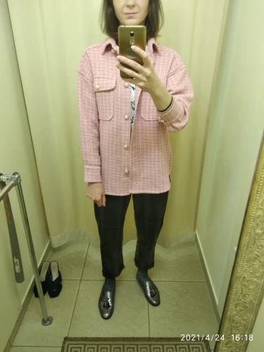 All Super sleeves are a little short but it's not scary. The fabric is translucent. But I took for the summer and I really like it) this is just a shirt, not a coat is not a jacket, namely a shirt) the buttons are badly held, but very beautiful, the smell from the product is specific of course, I read here somewhere about it, For me it is not critical I will wash simply.