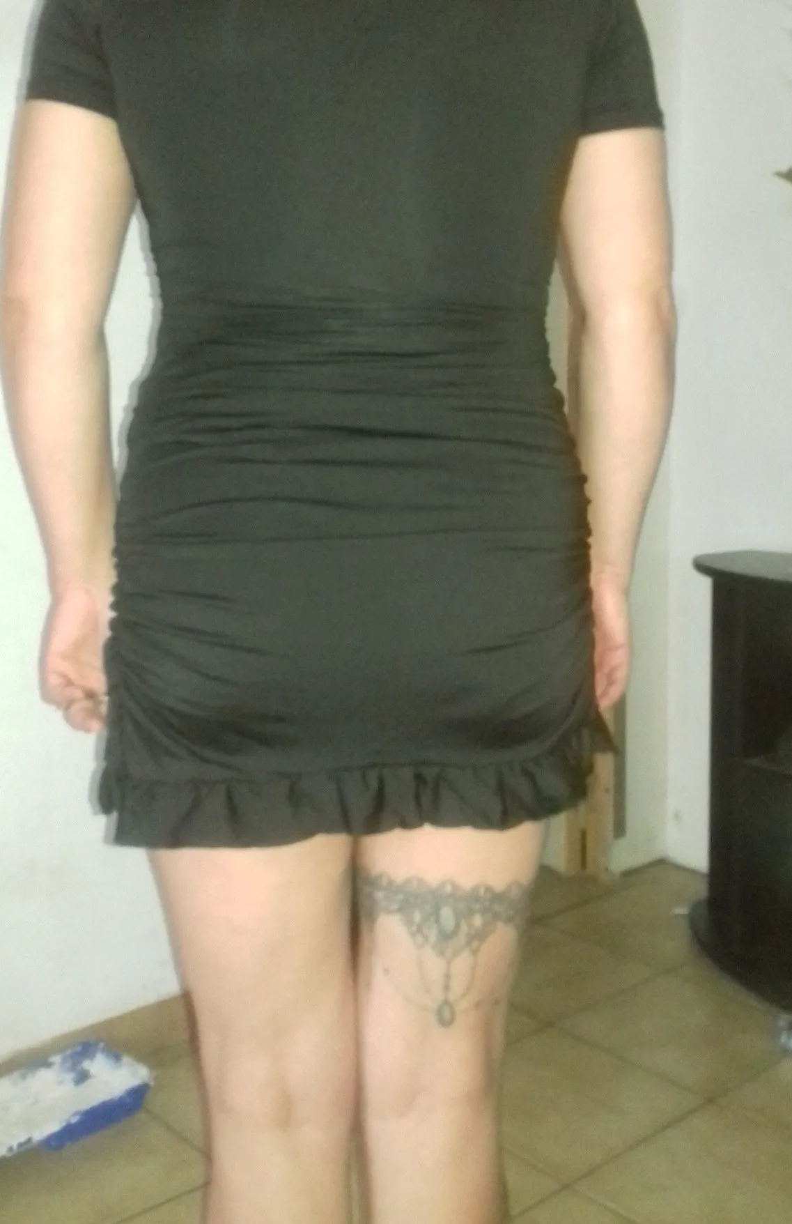 The dress is well sewn, nice material, although synthetics, the color is not as bright as in the photo, but also not bad. A little shines, I was in black panties this day. But I liked the dress, it will be cool in summer, now in Russia winter. Very fast came