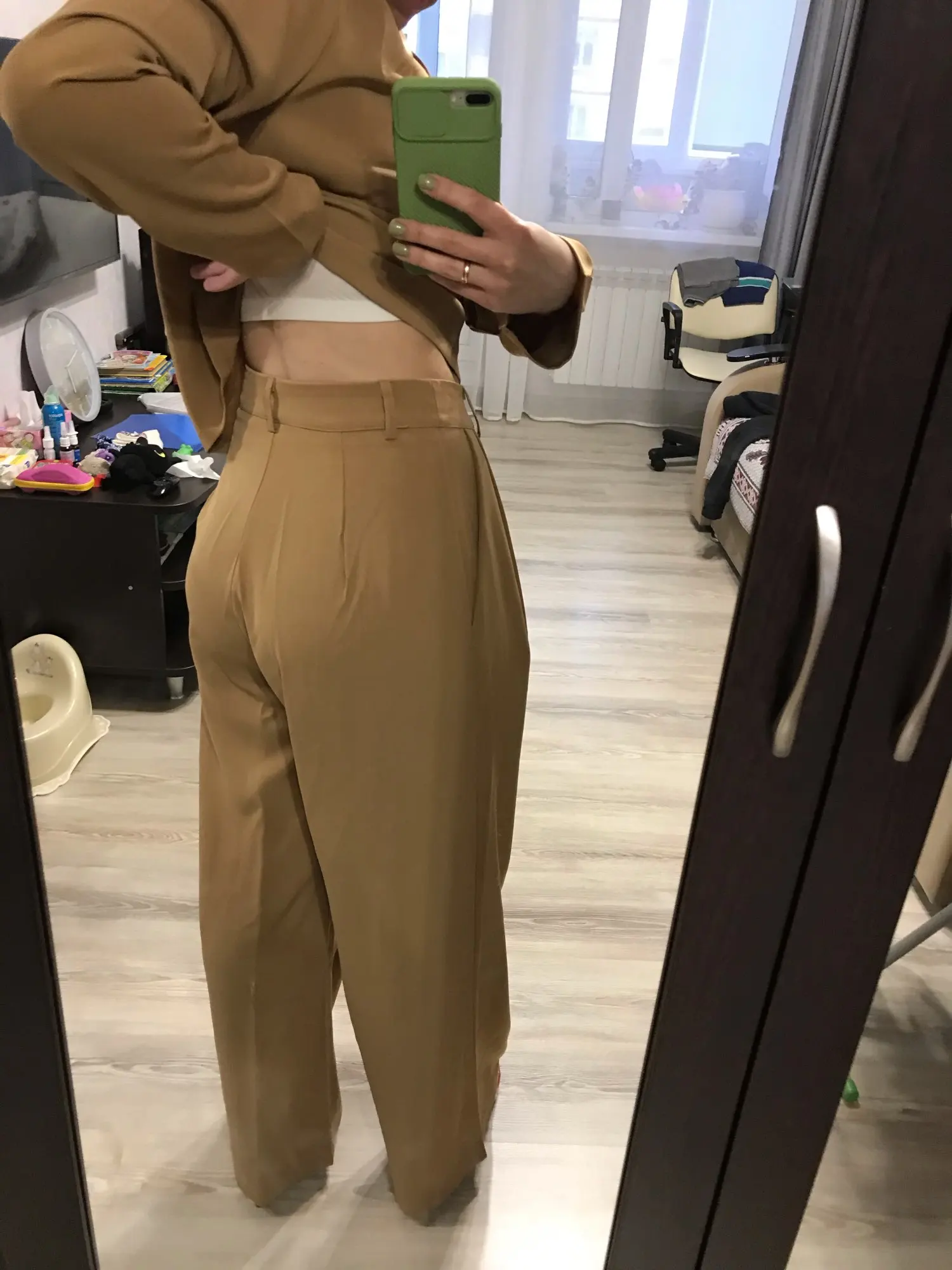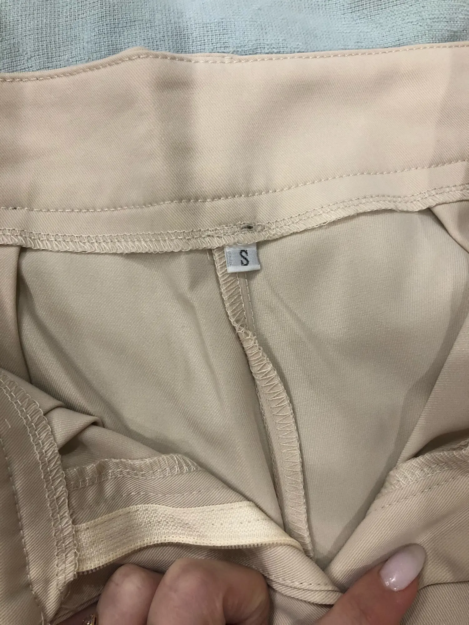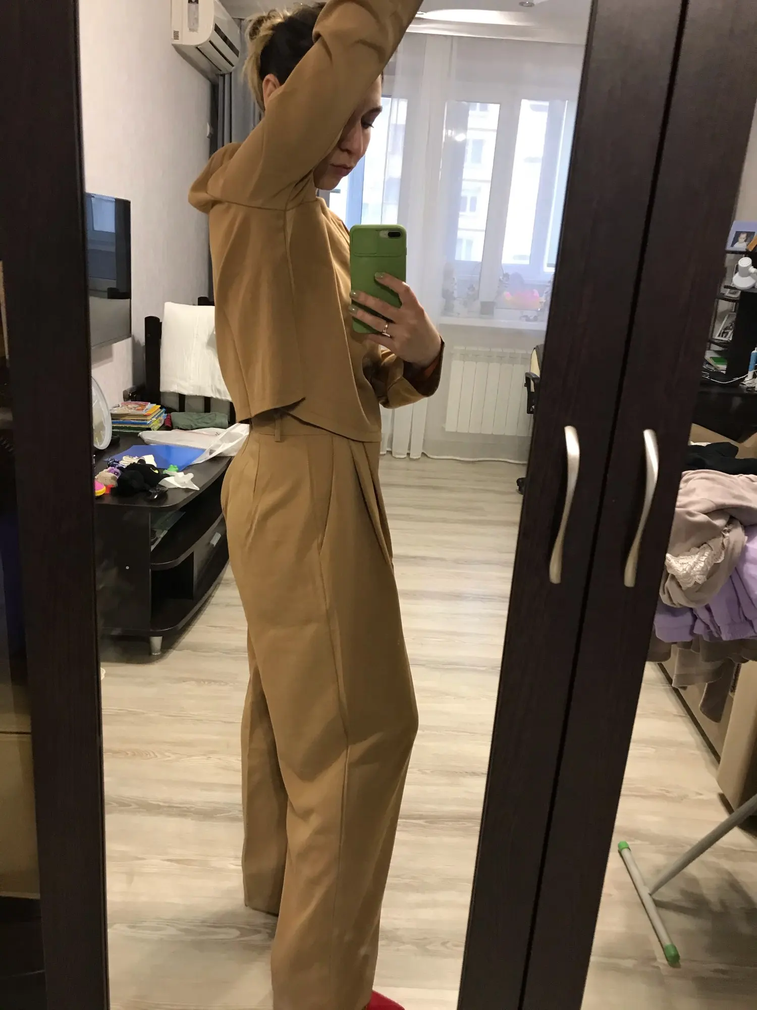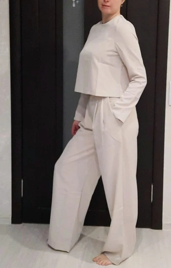 Suit with the coolest trousers. Blouse is also good in a suit, but in delight brought me pants, they are awesome. Long, voluminous, flying. The fabric of the suit is dense synthetics. On its parameters 84-64-90 height 172 cm, I chose the size s. I sat down like a suit on me and sewn. On the blouse there is a secret lock behind. Blouse shortened, straight cut. The color of the costume is sand, Noble. Pants have protectors in front and recesses in the back, there are belt loops and deep pockets. You can iron the arrows, I, on the contrary, ironed them. I liked the suit very much. Quality is amazing. Delivery to Kemerovo is just over a month. Track tracked. More of my reviews and videos on this product I have in telegpam: Masha.sovetuet