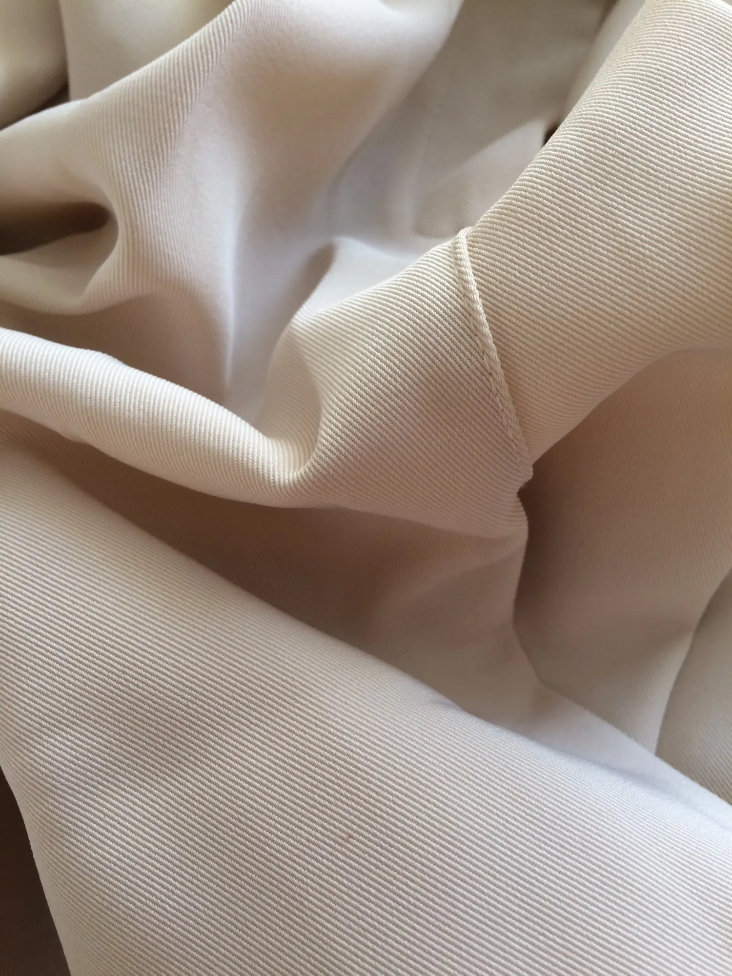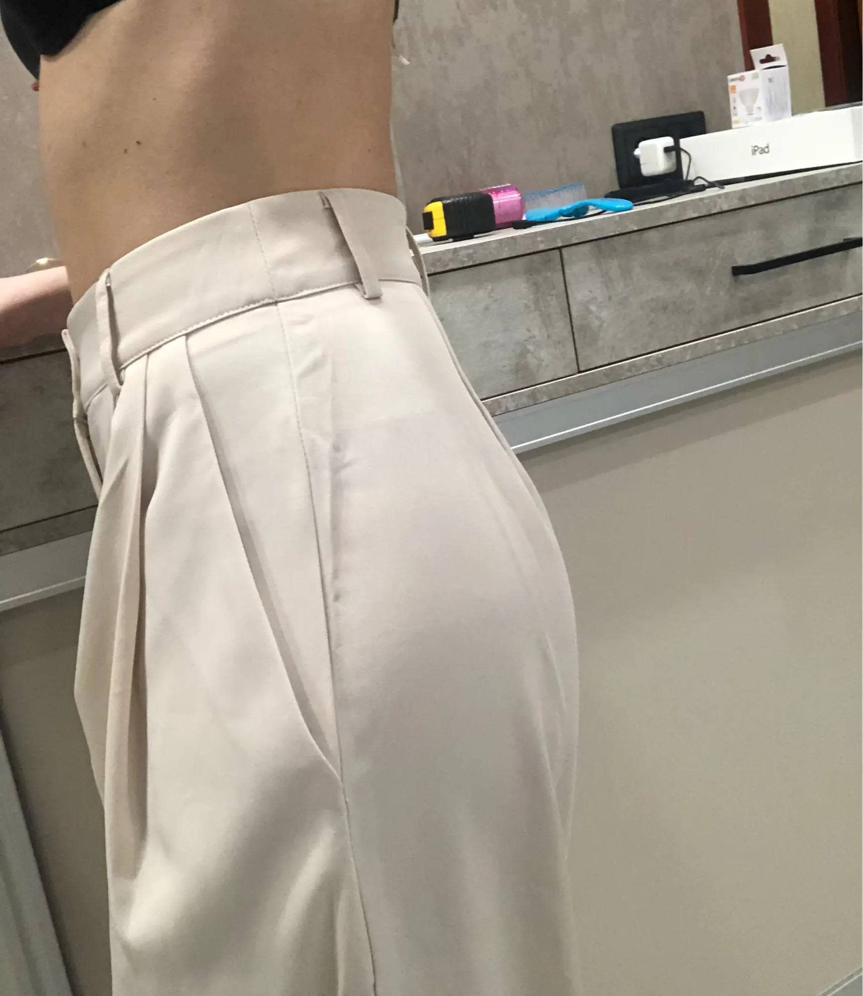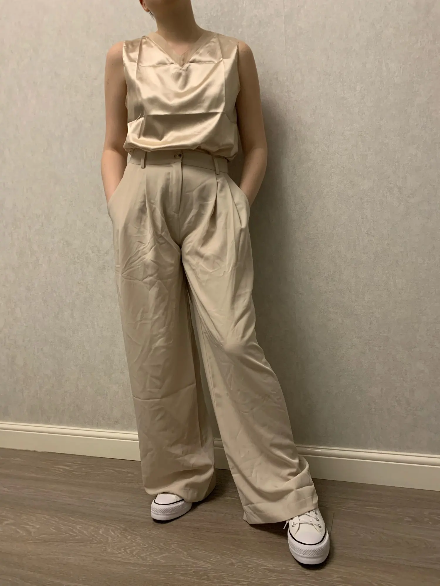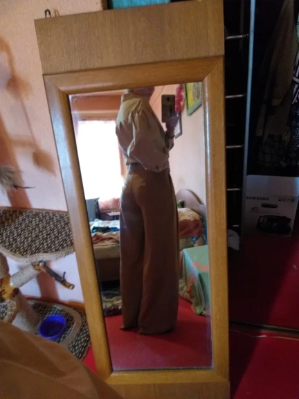 Suit with the coolest trousers. Blouse is also good in a suit, but in delight brought me pants, they are awesome. Long, voluminous, flying. The fabric of the suit is dense synthetics. On its parameters 84-64-90 height 172 cm, I chose the size s. I sat down like a suit on me and sewn. On the blouse there is a secret lock behind. Blouse shortened, straight cut. The color of the costume is sand, Noble. Pants have protectors in front and recesses in the back, there are belt loops and deep pockets. You can iron the arrows, I, on the contrary, ironed them. I liked the suit very much. Quality is amazing. Delivery to Kemerovo is just over a month. Track tracked. More of my reviews and videos on this product I have in telegpam: Masha.sovetuet