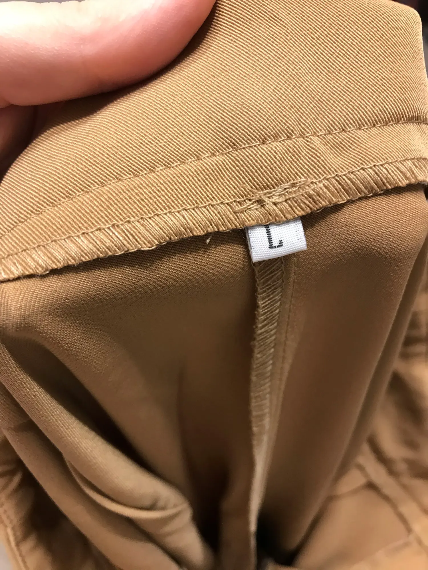 Size L is ideal for the ass 103 cm (46 size)., but it is possible and wider on the hips to dress. At the same time, the waist should not be thicker than 75 cm. Pants are not stretched. Very long for a height of 170 cm with heels of 11 cm still long. I will sew on cm 5-10. Color chic dark sand (light brown). High landing. Waist narrow 75 cm. The Ass in these pants is cool and the pants do not increase the volume, and the turnover makes slimmer if there is a waist. Fabric suit, thin, summer.