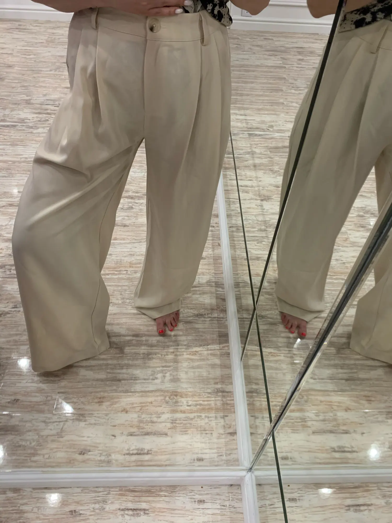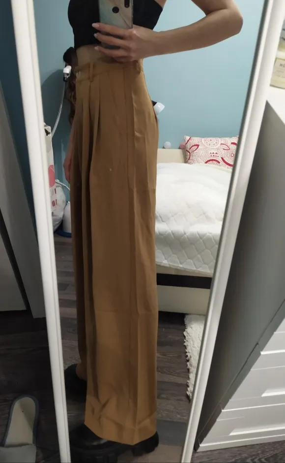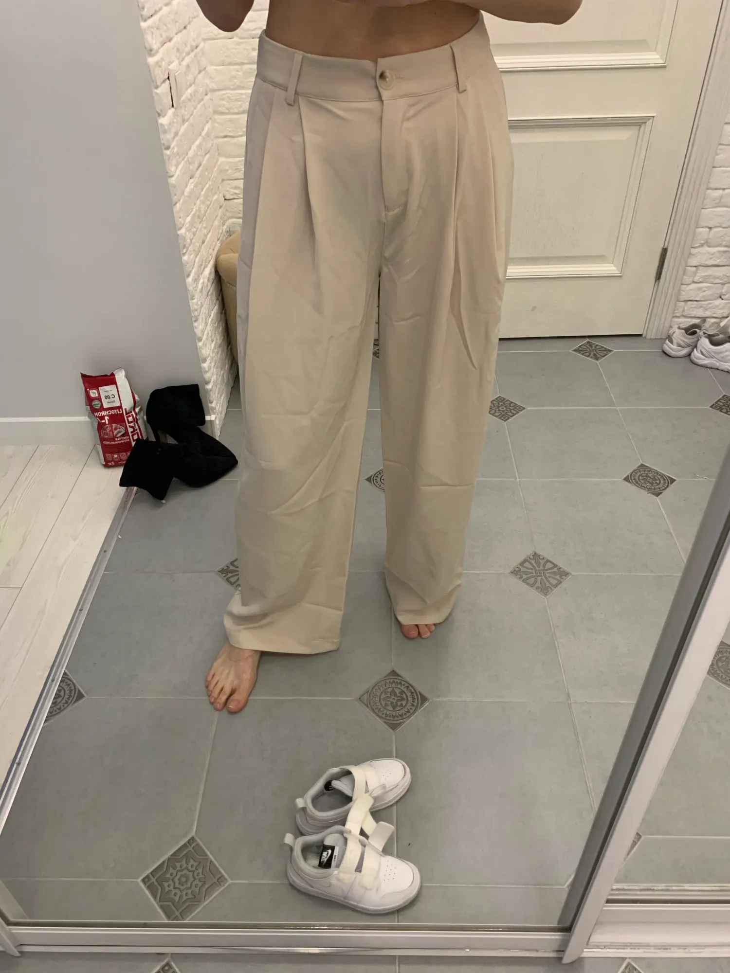 Отличные брюки «палаццо», полностью соответствуют фотографиям продавца; на мой рост 158 см длинные; не маломерят: я в жизни ношу s-m, заказала s, немного свободные в талии, но не спадают; на попе есть выточки, красиво будут сидеть на девушках с высокой круглой попой) ткань синтетика, но без дешевого блескам и довольно тяжелая, вид у брюк не дешевый; пара ниточек, но не критично; цвет красивый: холодный светлый беж; мне понравились, спасибо)