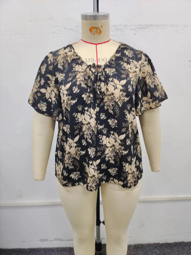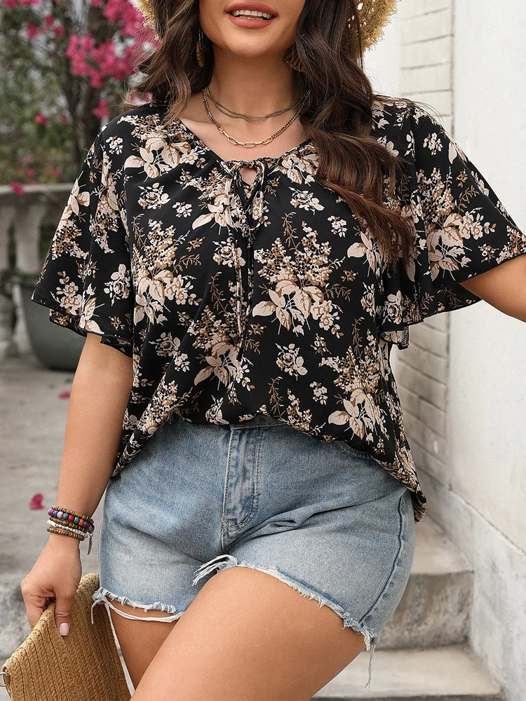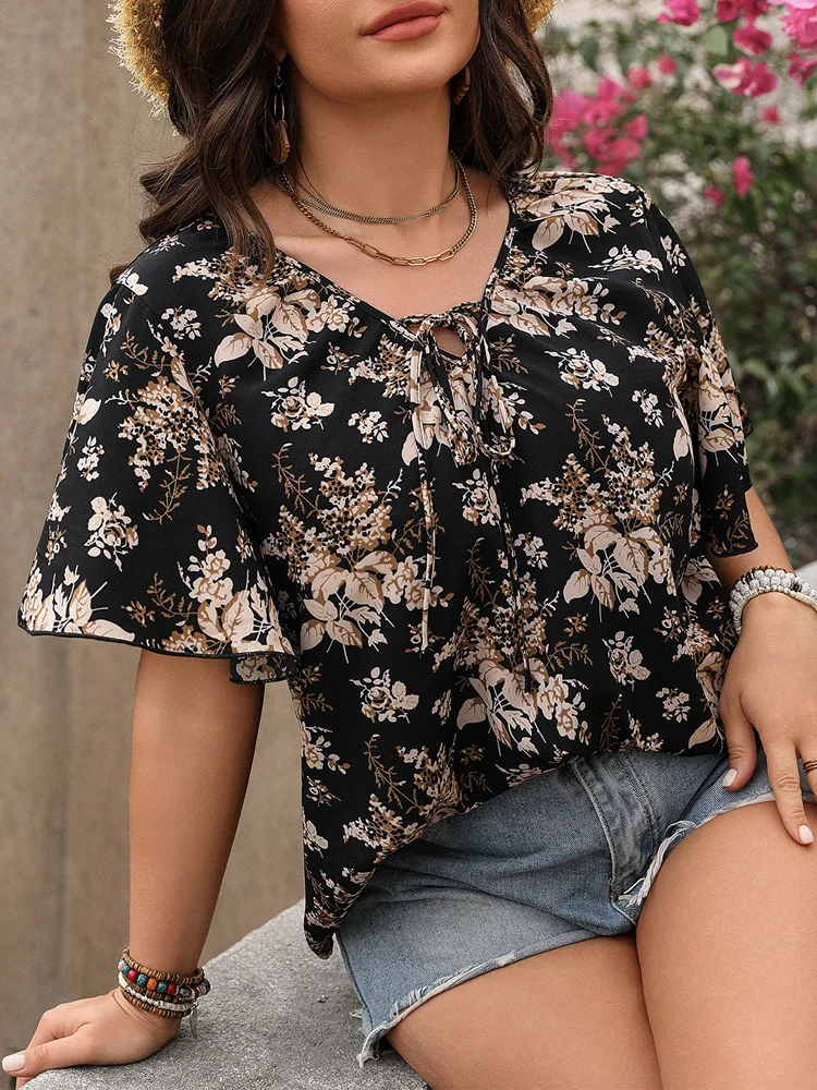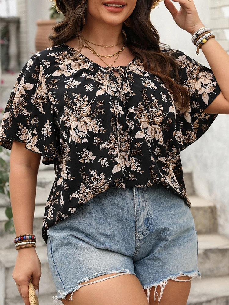 2025 New Boho Floral Tie Neck Plus Size Blouse Summer Butterfly Sleeve Casual Loose Top JKP7338