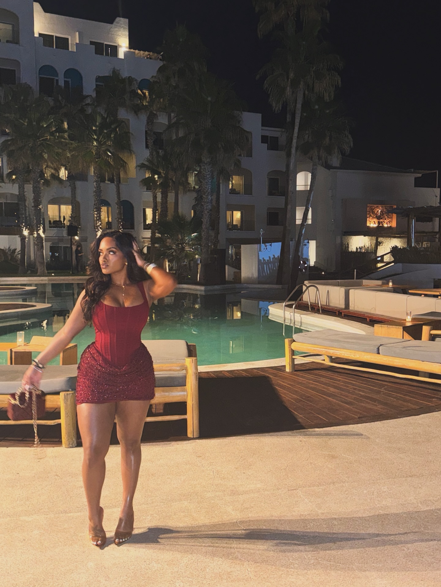 Obsessed with this little red dress! The sleeveless cut is chic and the sequin fabric feels high quality. Perfect for a night out.