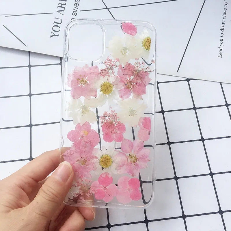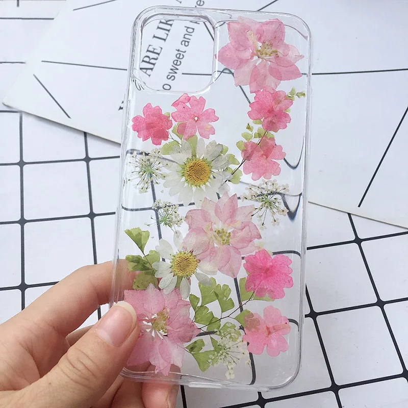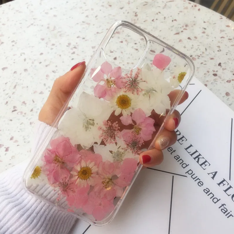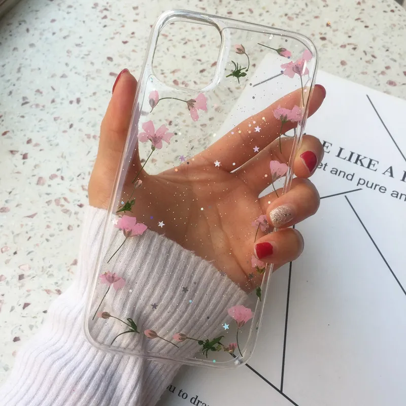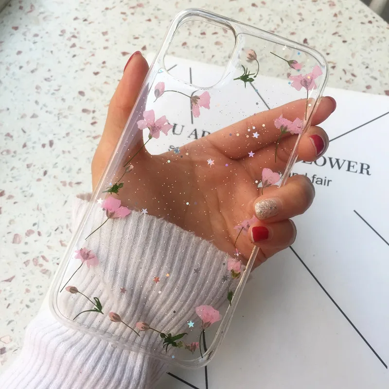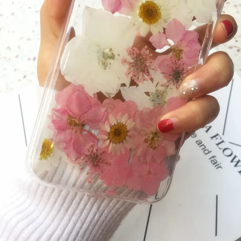 Very beautiful case with real flowers, I have a bit of a flower outside the gel and can be seen, that he was real. The edges are slightly rough, somewhere not