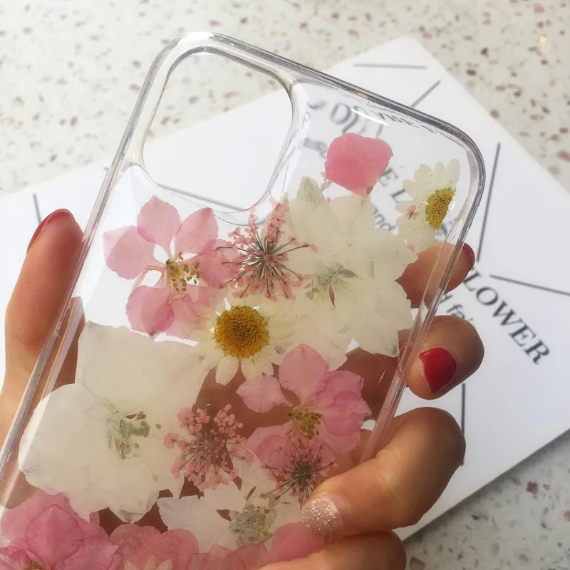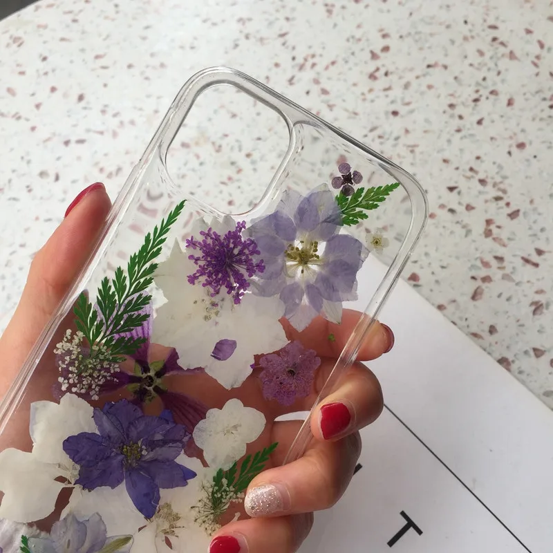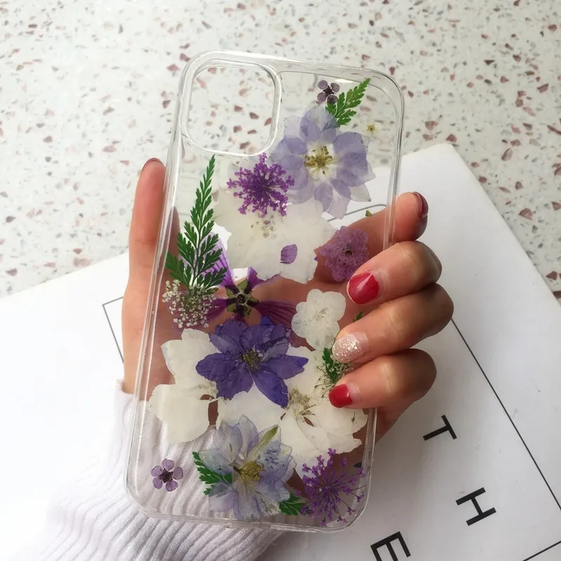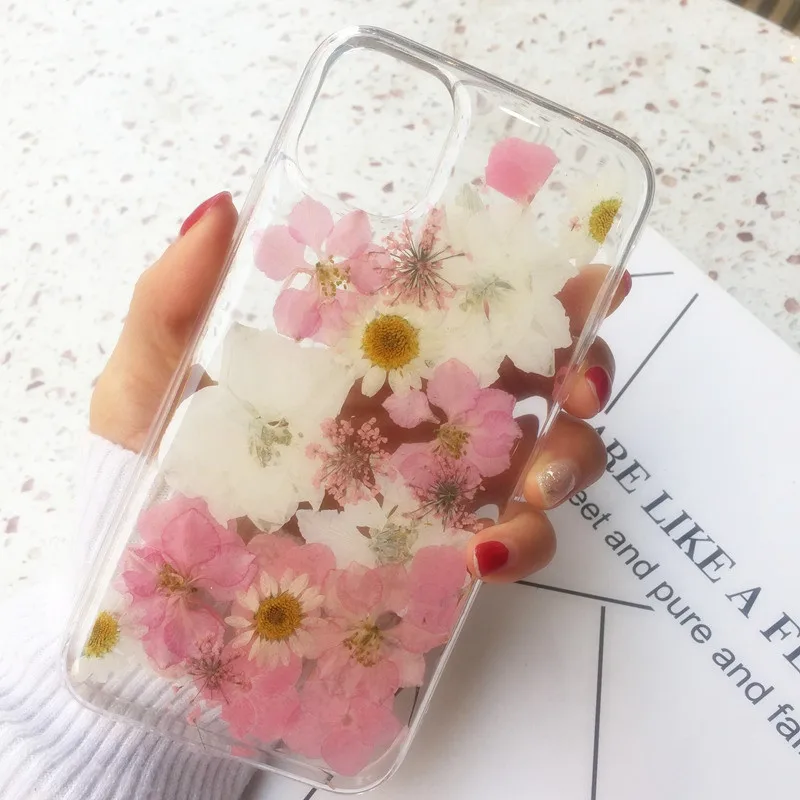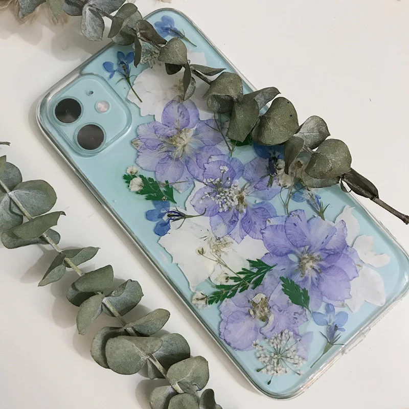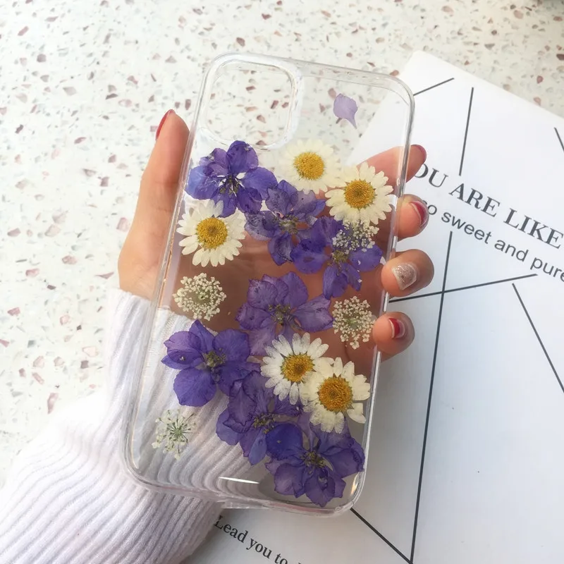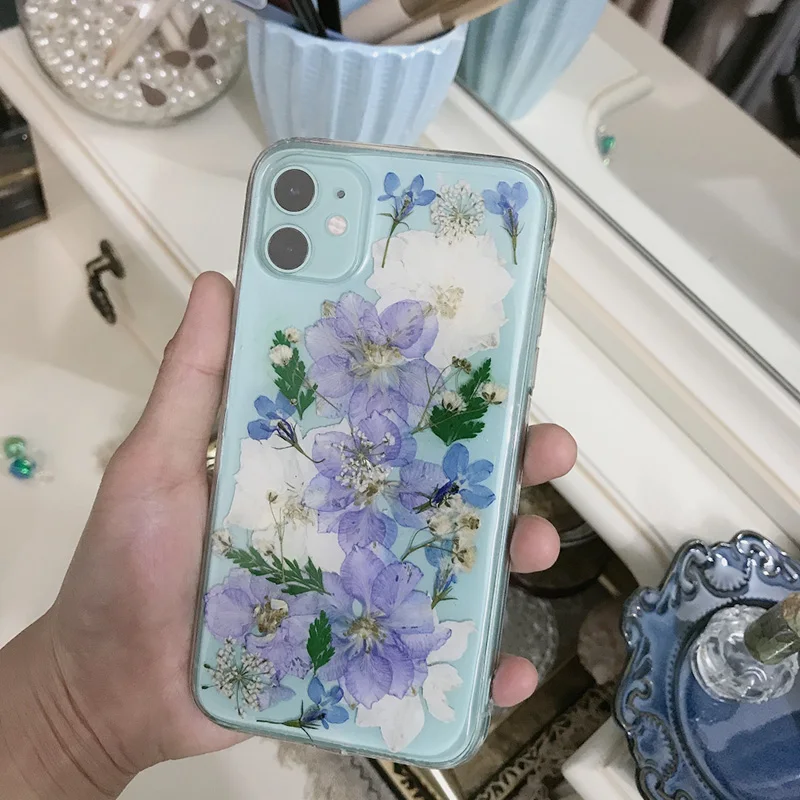 iphone 11. Super pretty on purple phone. It’s really easy to use the volume and off buttons with the case on. Really pretty with real flowers. Decent delivery time.