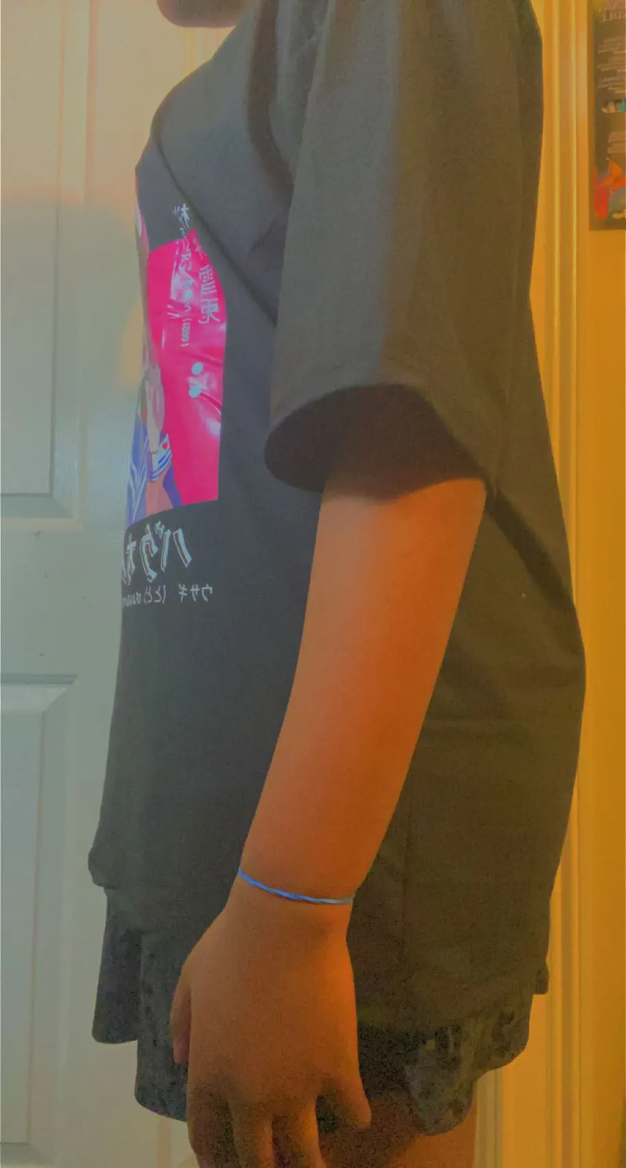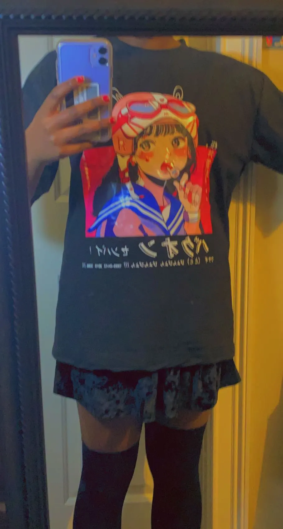 It’s a really cute shirt i got it a little big since i like oversized shirts but im top heavy so it fits like a large medium and the image material is kinda plasticy kinda like vinyl so it may have to be be dry cleaned but over the shirt is really cute