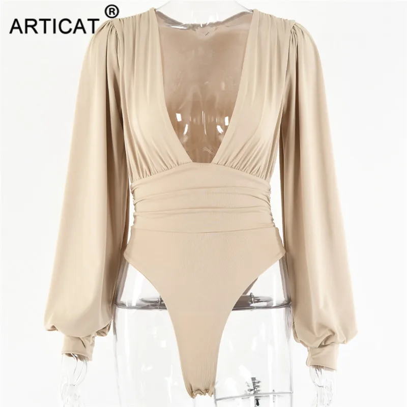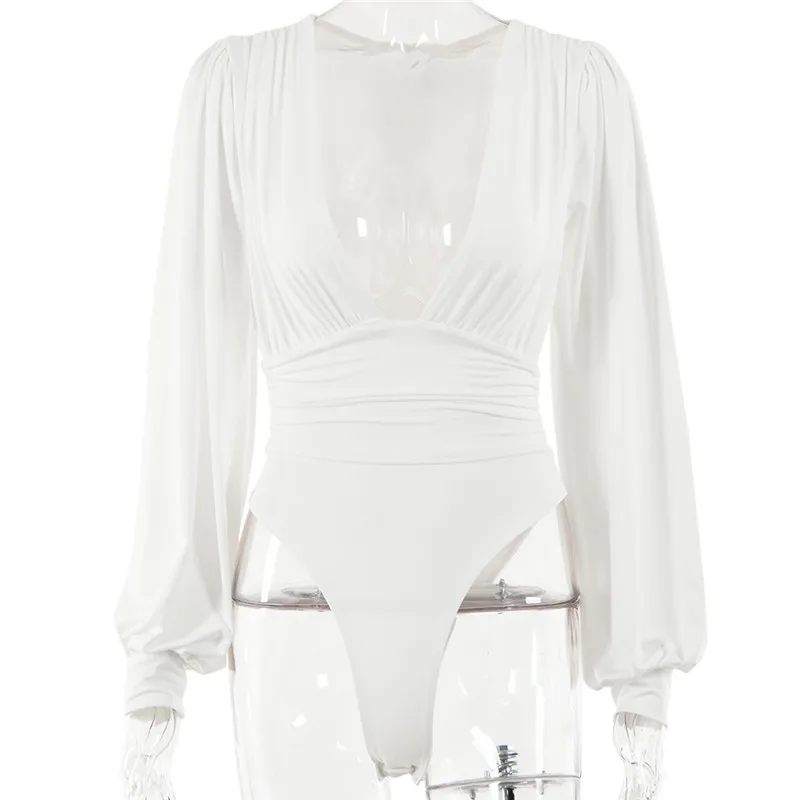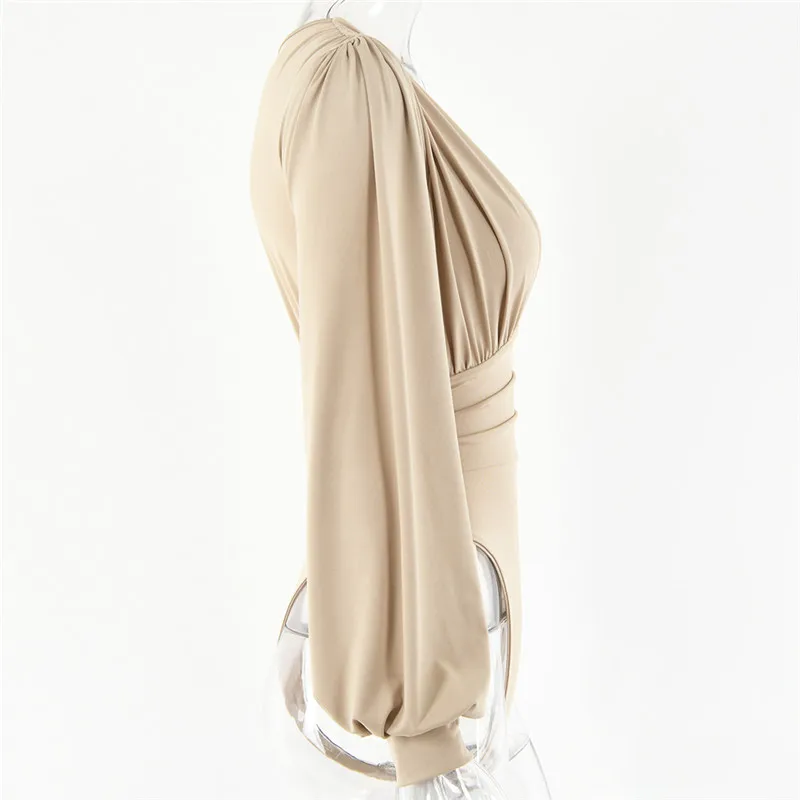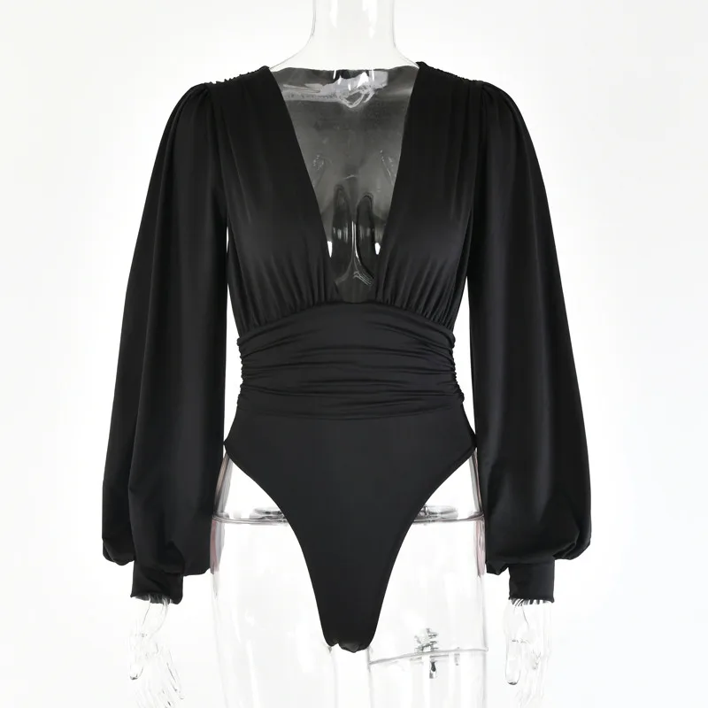 FREE SHIPPING 2022 Women Elastic Bodysuit Puff Sleeve Bodycon Solid JKP5972