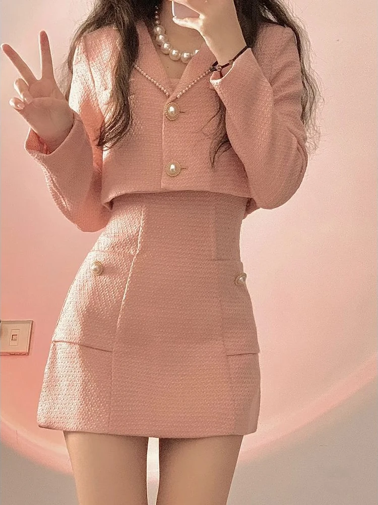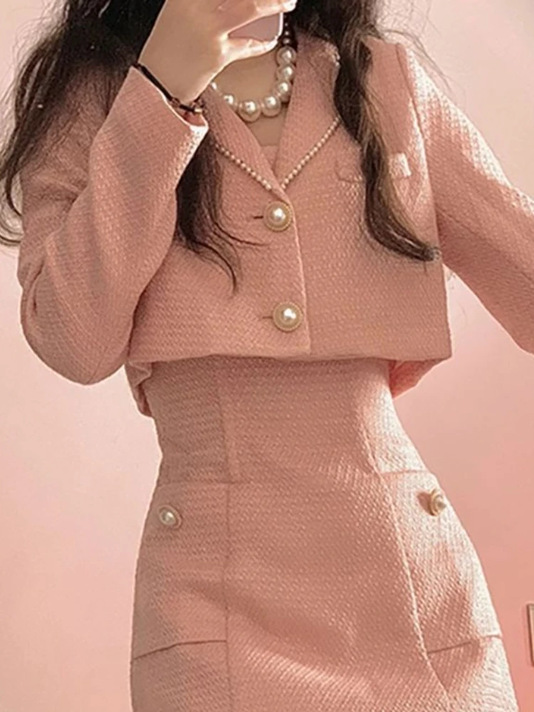 FREE SHIPPING Women Autumn Elegant Korean Style Tweed Blazer Coat And Strap Mini Dress Two Piece Set JKP6076