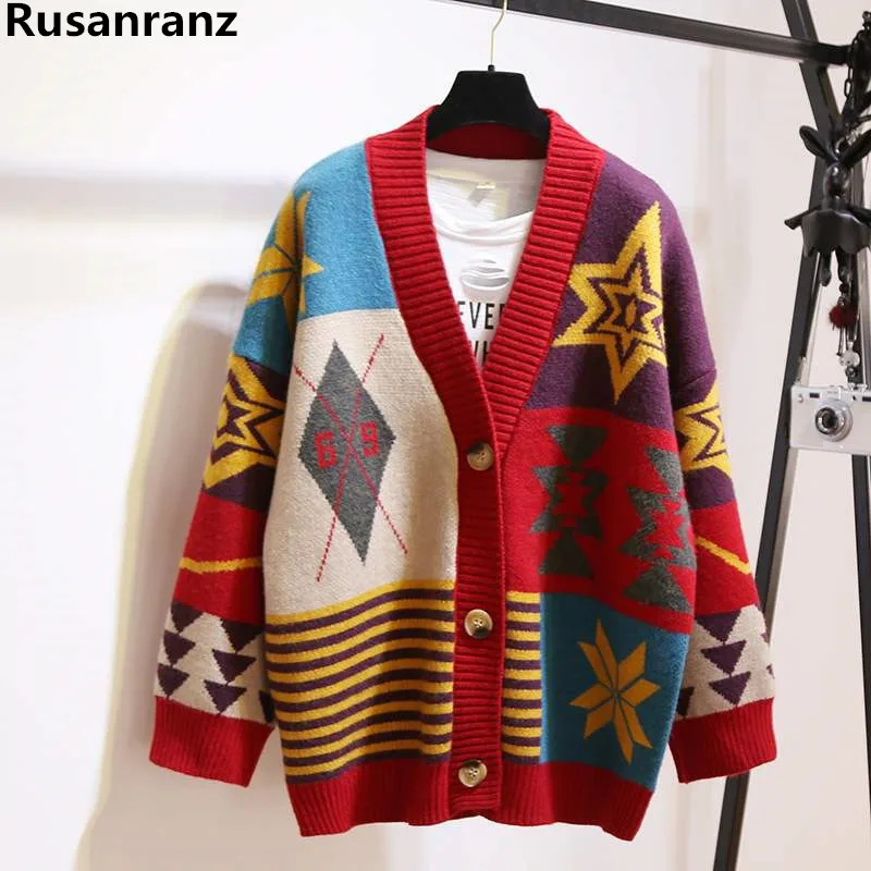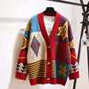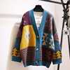 Autumn Winter Sweaters Plaid V-Neck Cardigans Single Puff Sleeve Loose