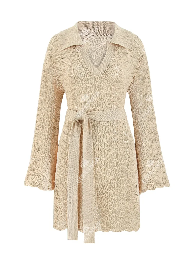 Beige Crochet Belted Mini Dress Trendy Knit Beach Cover Up with Flared Sleeves JKP7405