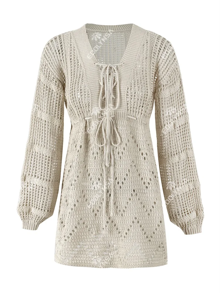 Beige Crochet Knit Mini Dress Long Sleeve Beach Cover Up with Front Tie JKP7406