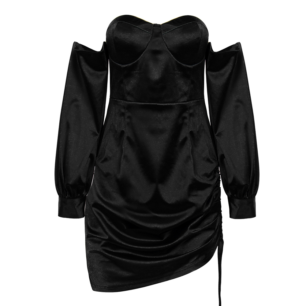 Black Bodycon Mini Party Dress Off-The-Shoulder Tube Top Loose Sleeves Smocked Tiestring