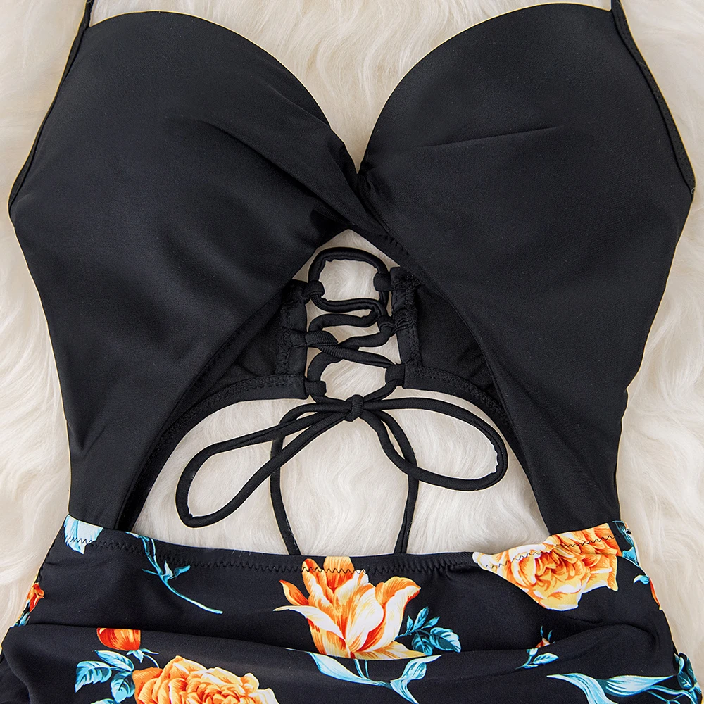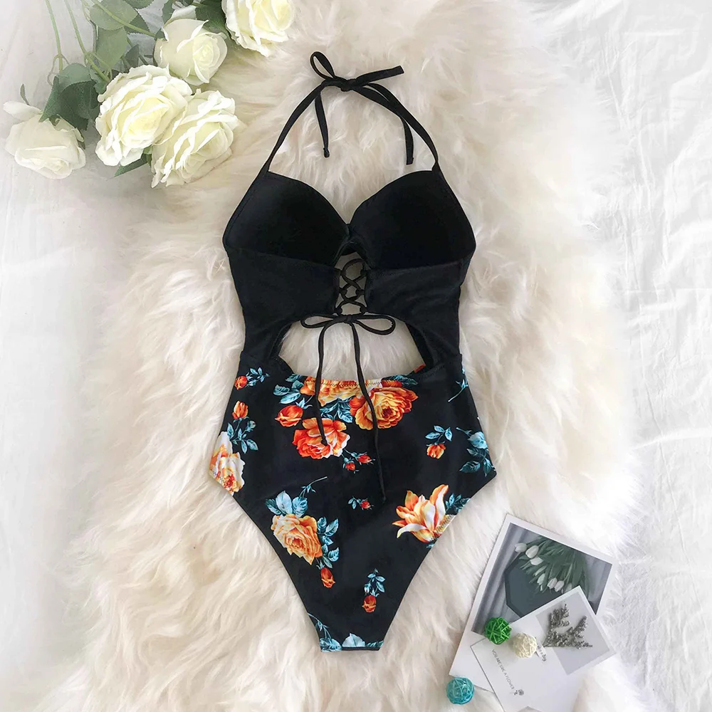 Black Floral Print Halter One-Piece Swimsuit Boho Monokini Swimwear