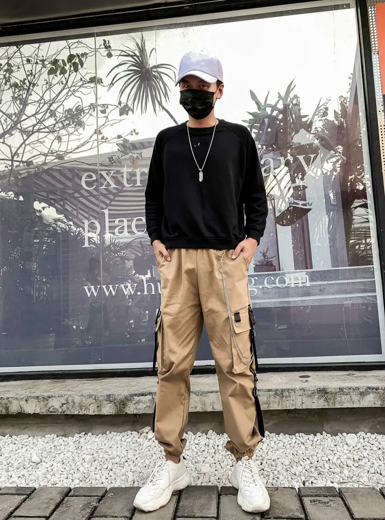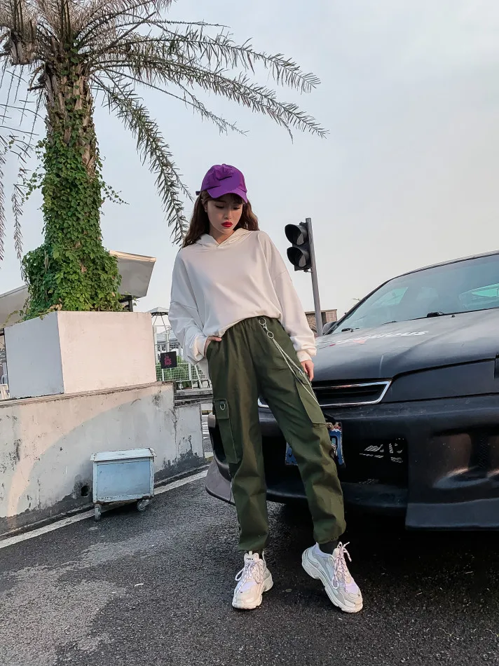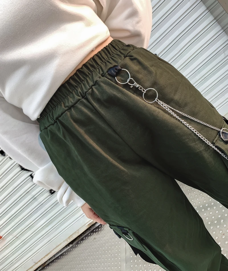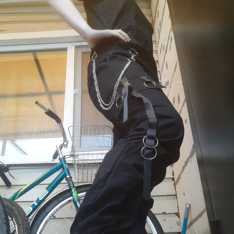Black Harem Pants Streetwear Cargo Pants Harajuku Chain Pockets Ankle Trousers High Waist Chain Hip-hop Punk