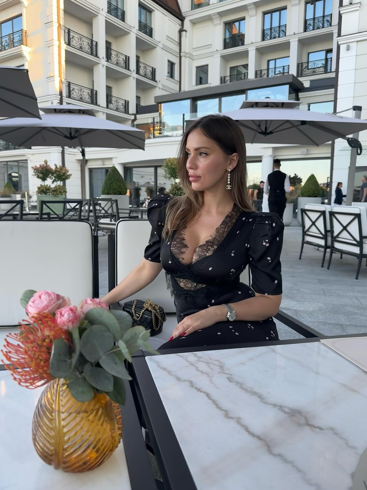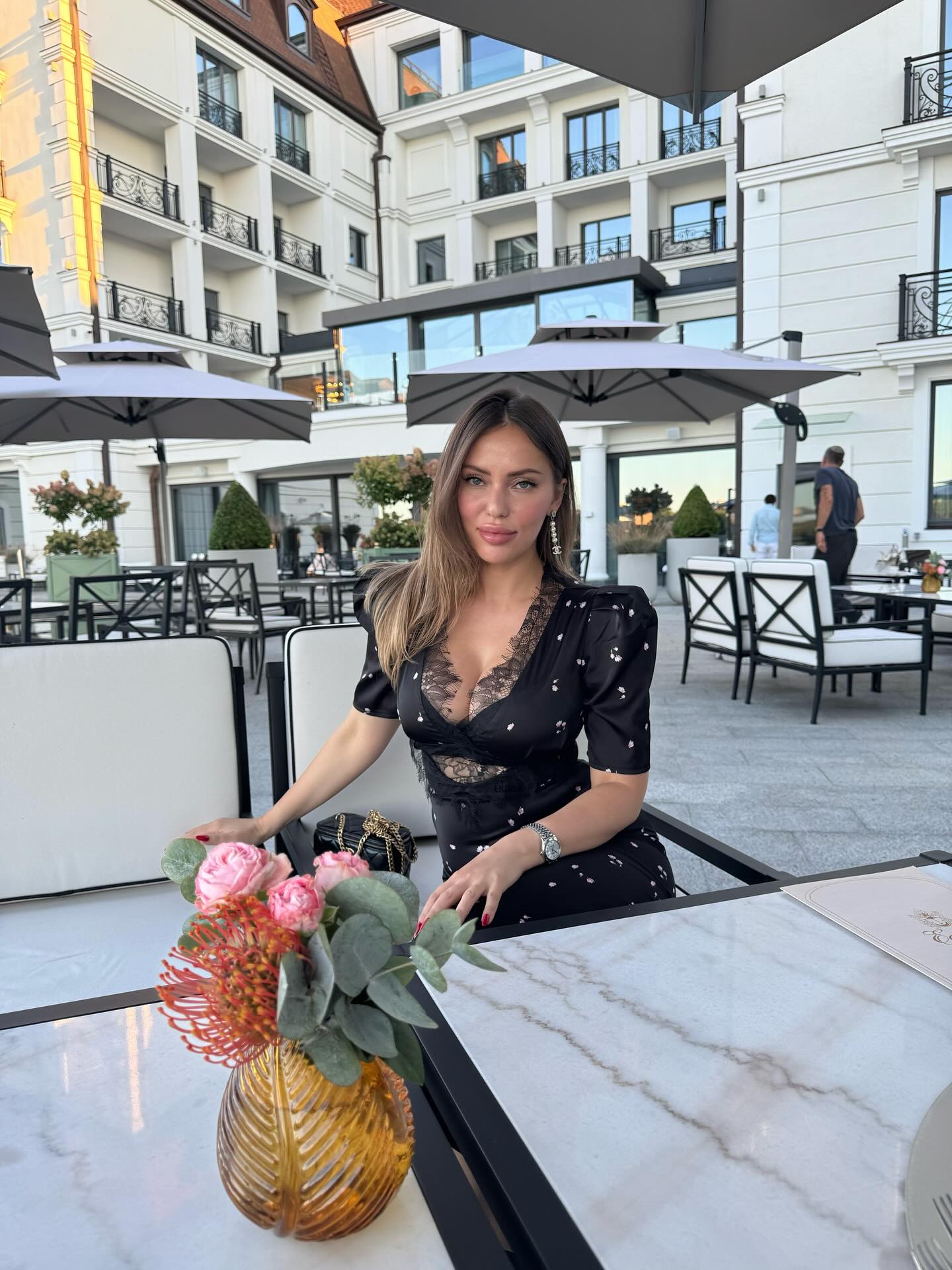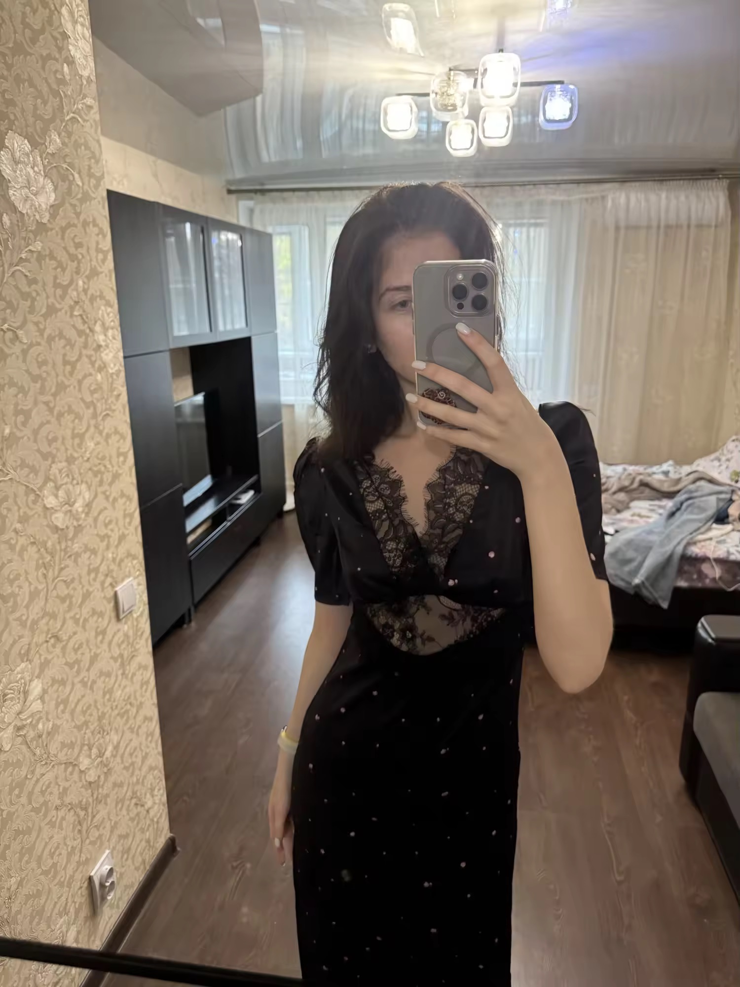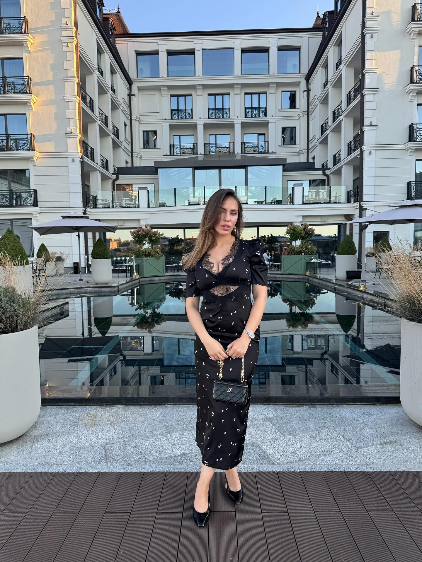 That black midi dress with delicate dots and lace details is absolutely stunning! The satin fabric feels so luxurious, and it fits beautifully, creating an elegant and glamorous look for any special event.