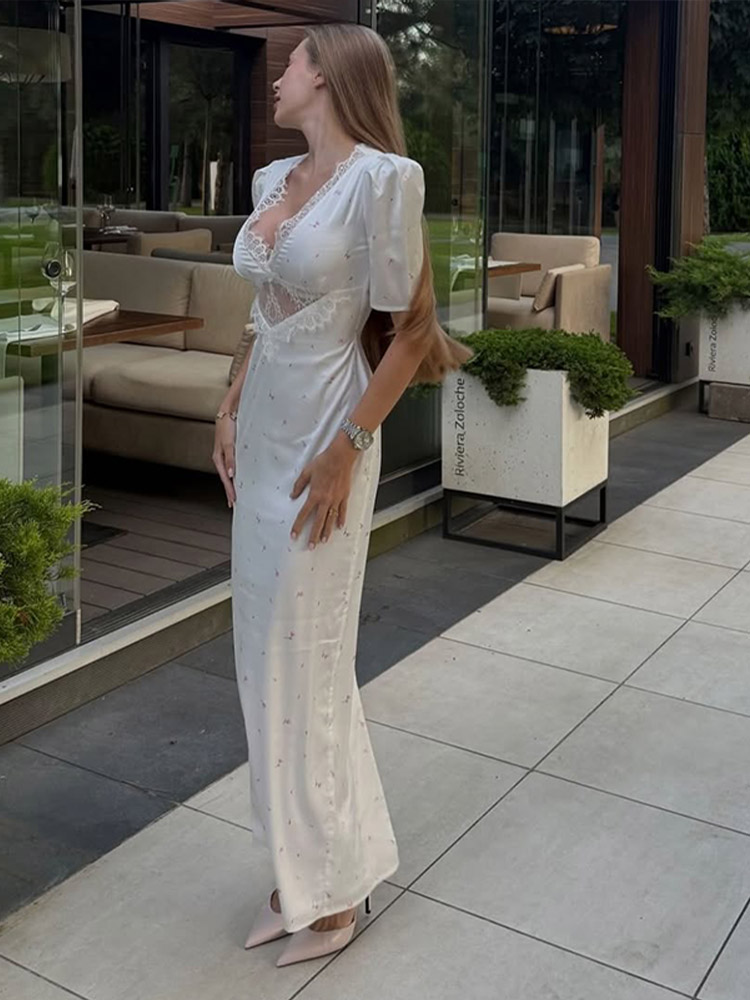 Honestly, this white satin dress with lace bits is just gorgeous. The fabric’s so silky, and the lace looks really delicate—those tiny blue flowers are adorable. Wore it to a brunch yesterday, felt so elegant, got tons of compliments, and the quality’s actually really good. I’m obsessed with it!