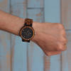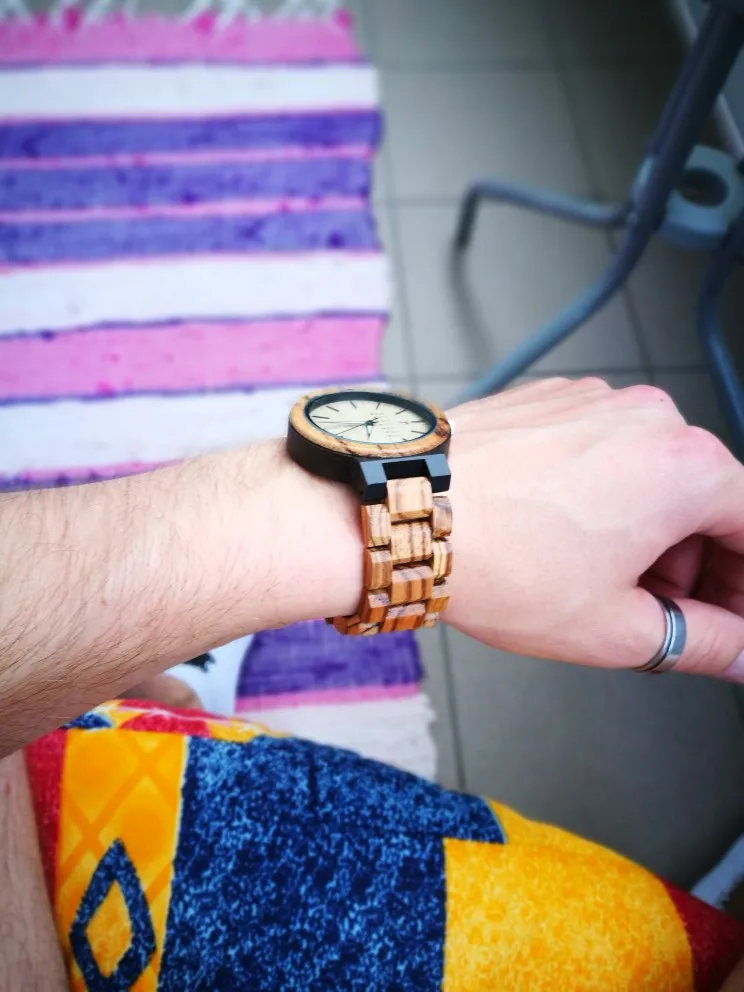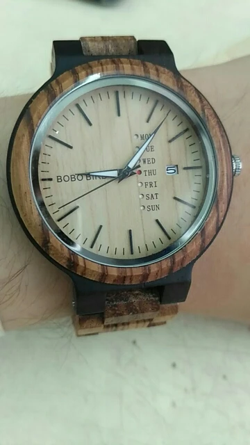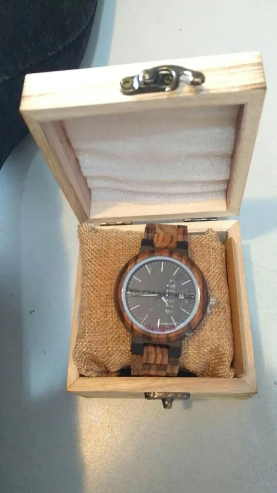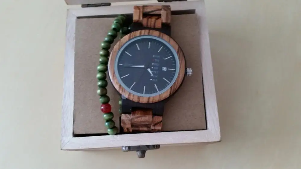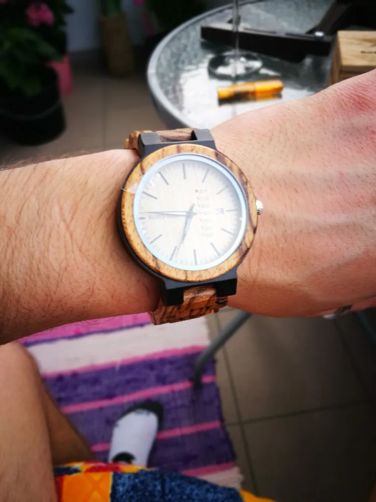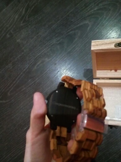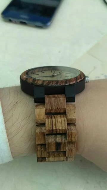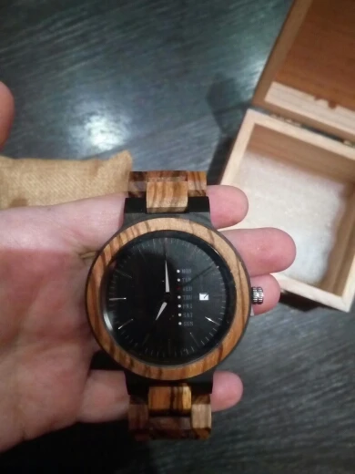 The turned off watch arrived is less than month. He was packed in a box with an engraving, on a pillow made of jute string. In the middle a bracelet shrinking tool. The watch is very light, you can see the texture of the tree. The sitting wheel has three modes: to change the time, date, and day of the week. The tips glow in the dark. THIS IS THE MOST BEAUTIFUL WATCH THAT I COULD DREAM OF!!!