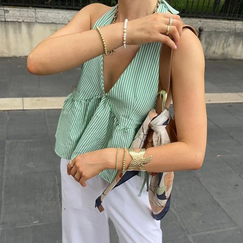 Boho Plaid Babydoll Crop Top Coquette Halter Backless Vest JKP7295