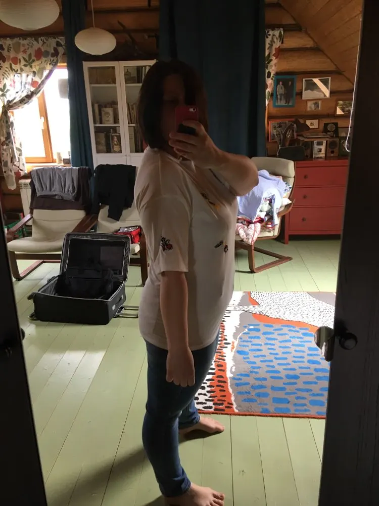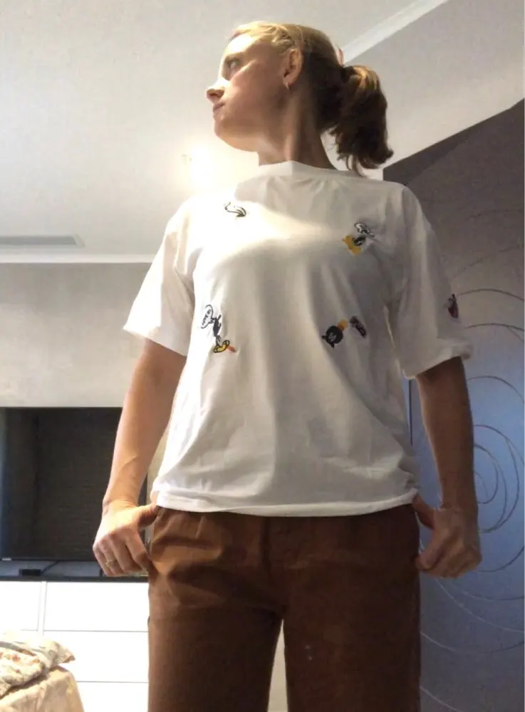 The parcel came in 3 weeks, there is no unpleasant smell, the thread does not stick out, it sits perfectly. I recommend taking on a larger size, I wear M, I ordered L and straight well. The fabric feels nice. Embroidery is made well.