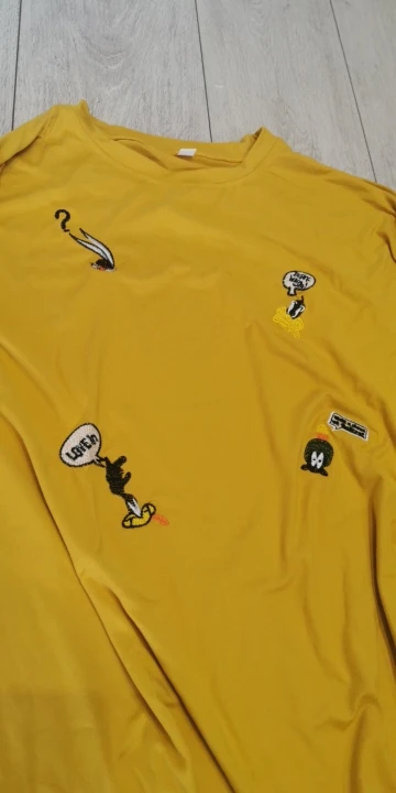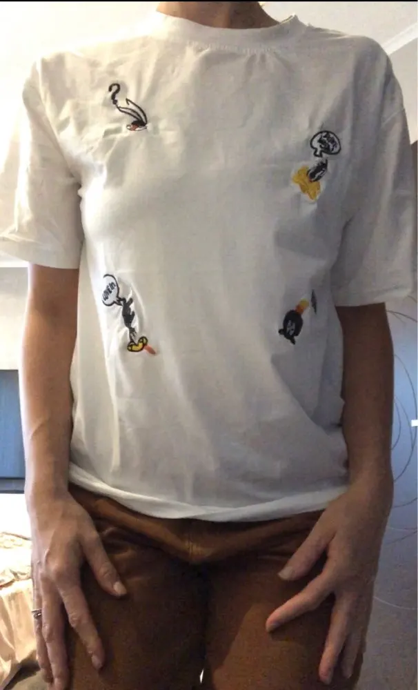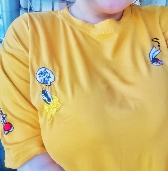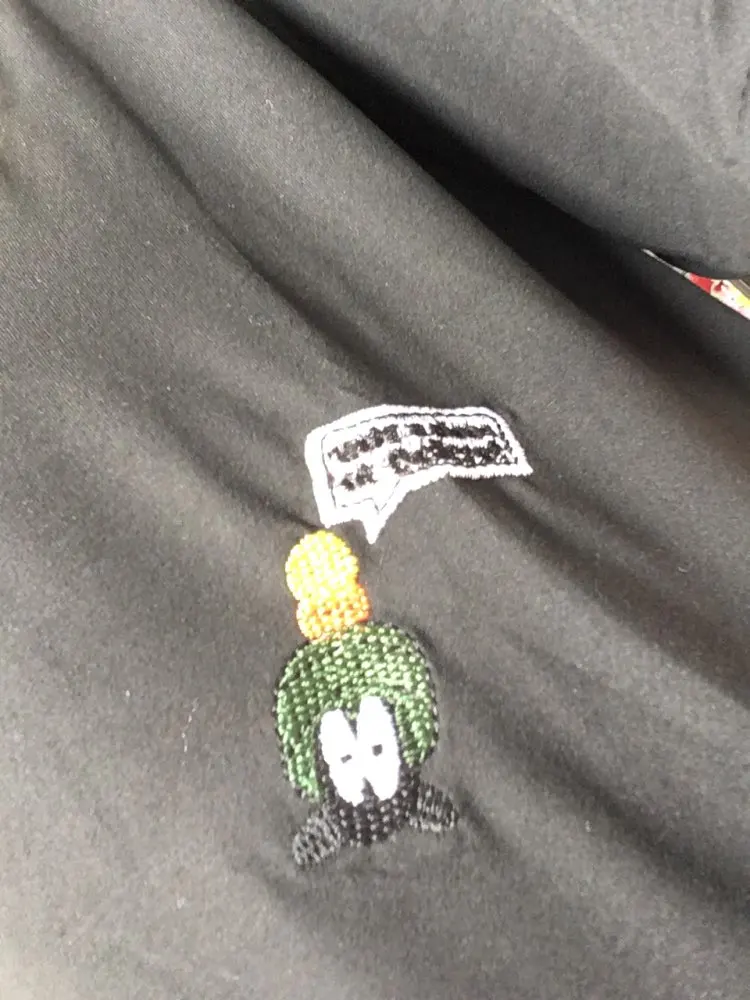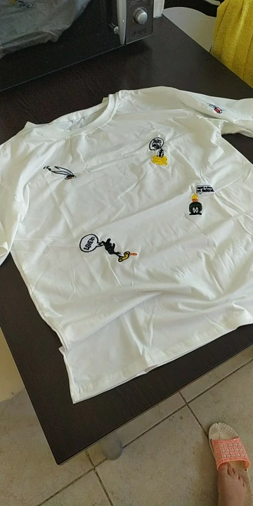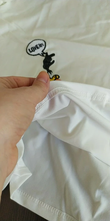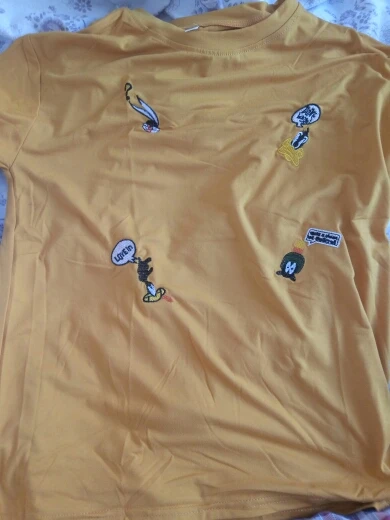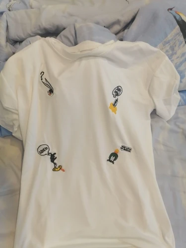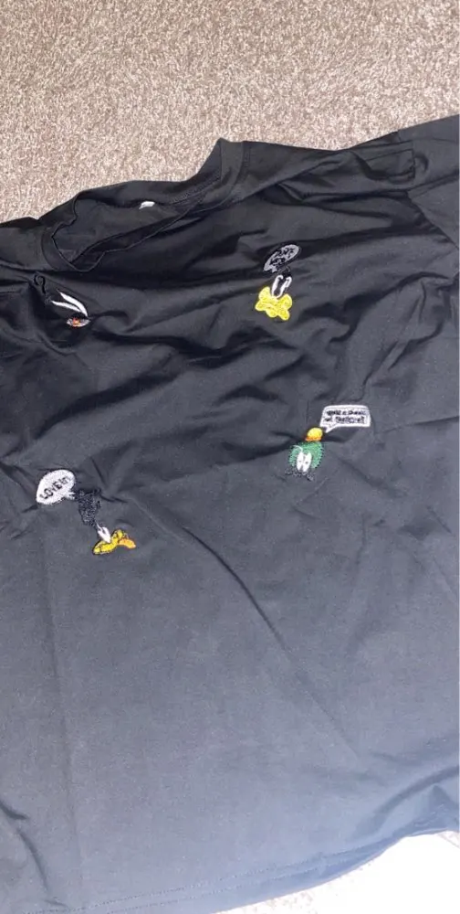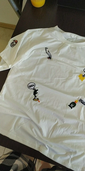 The T-shirt is beautiful, all the cartoons are stitched. The fabric is pleasant to the touch but not HB.