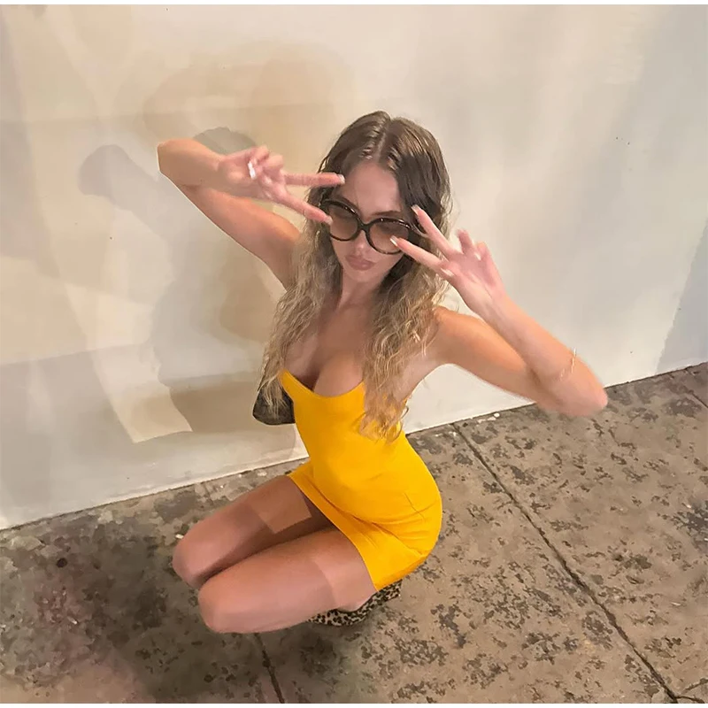Chic Mini Pleated Knitted Dress Pink And Yellow Color Style U Neck Sleveeless Bandage Slim JKP7312
