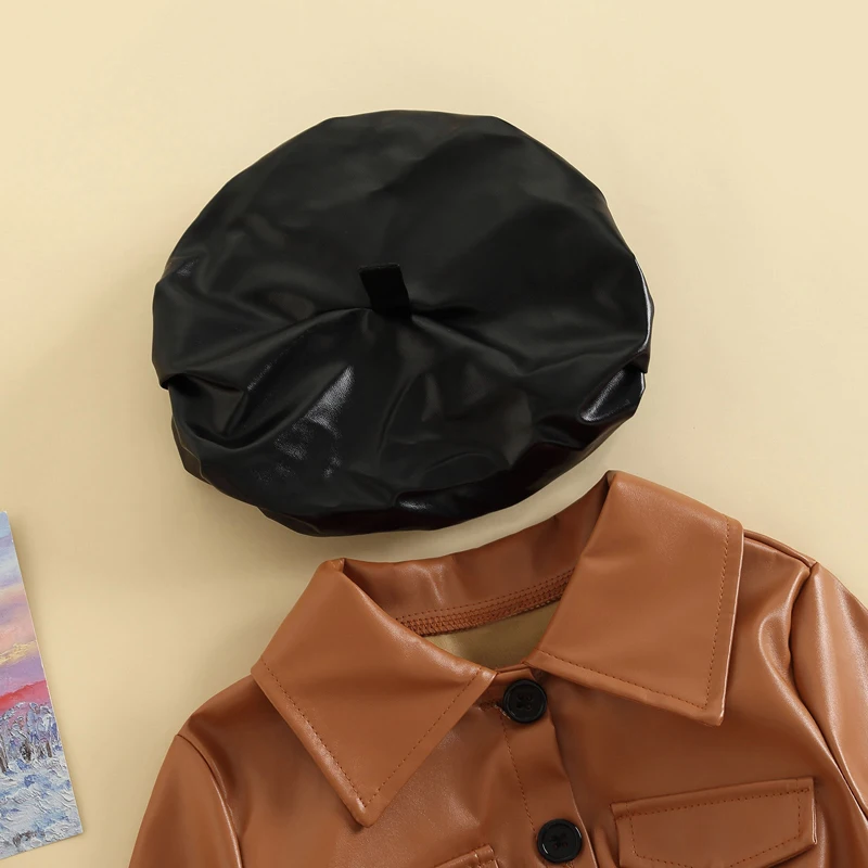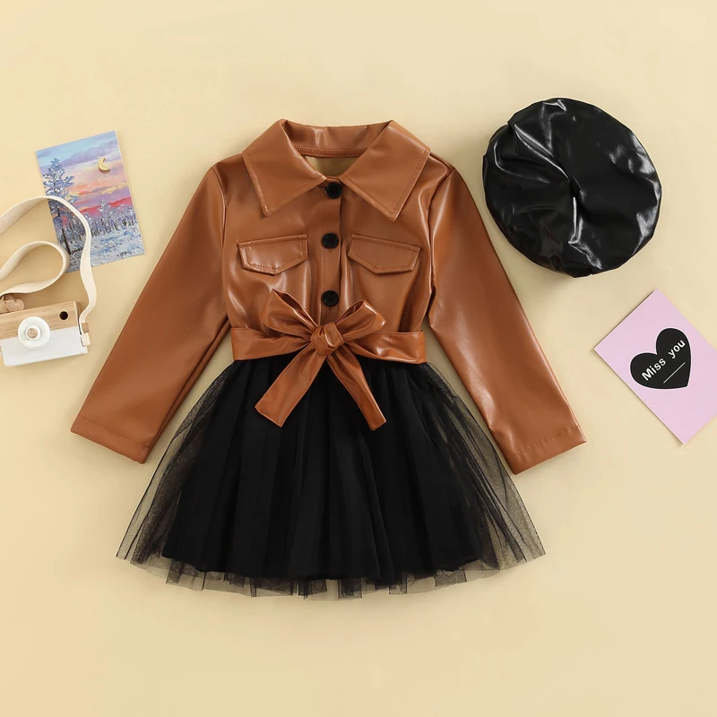 Children Girls Fashion Dress with Beret Hat Baby Autumn Clothing Kids Long Sleeve Lapel PU Leather Patchwork Tulle Dress JKP6099