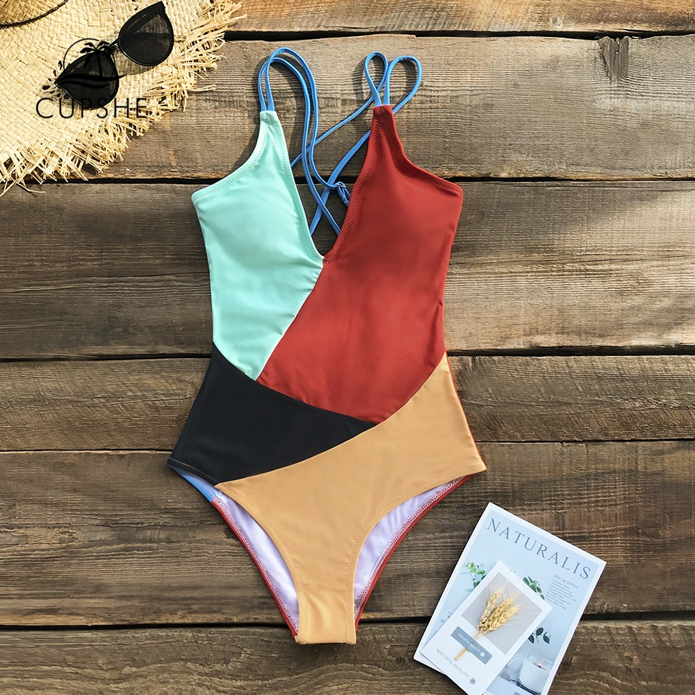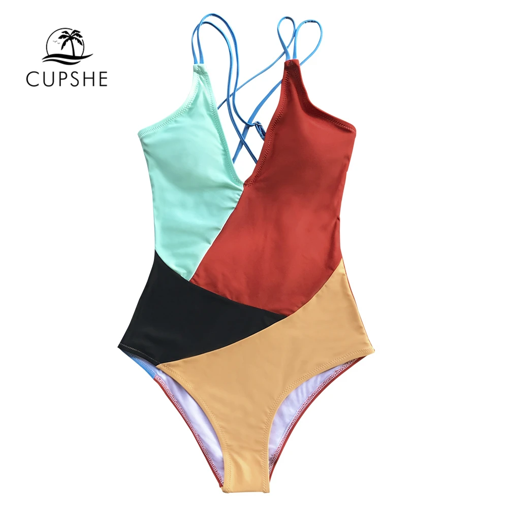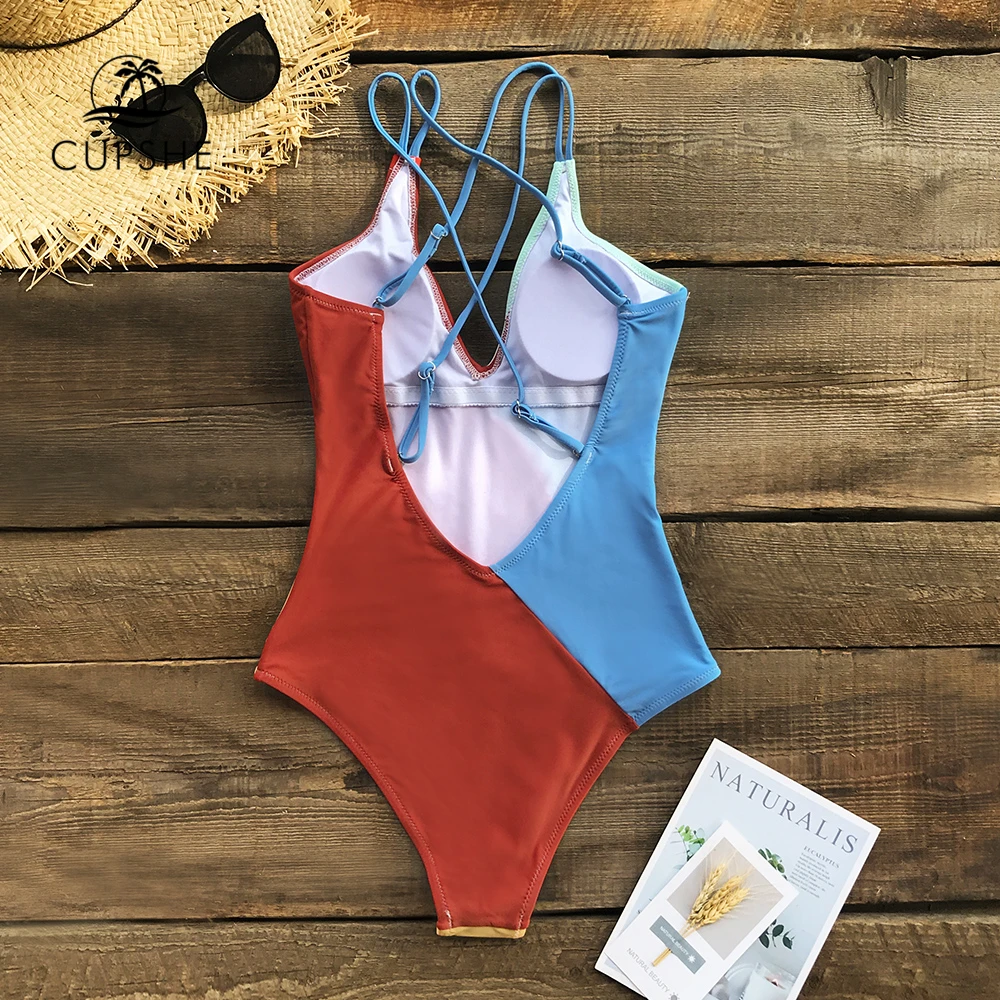 Colorblocked V-Neck Strappy One-Piece Swimsuit Backless Padded Monokini