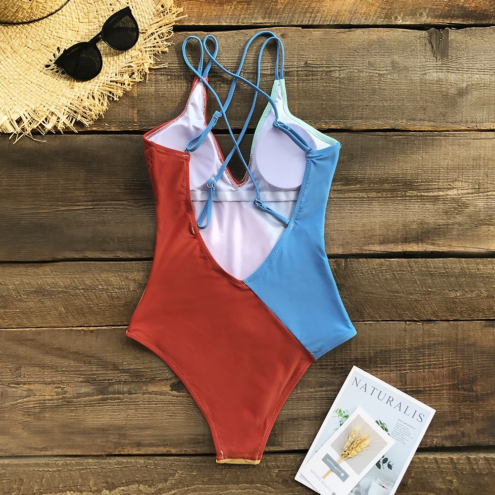 Colorblocked V-Neck Strappy One-Piece Swimsuit Backless Padded Monokini