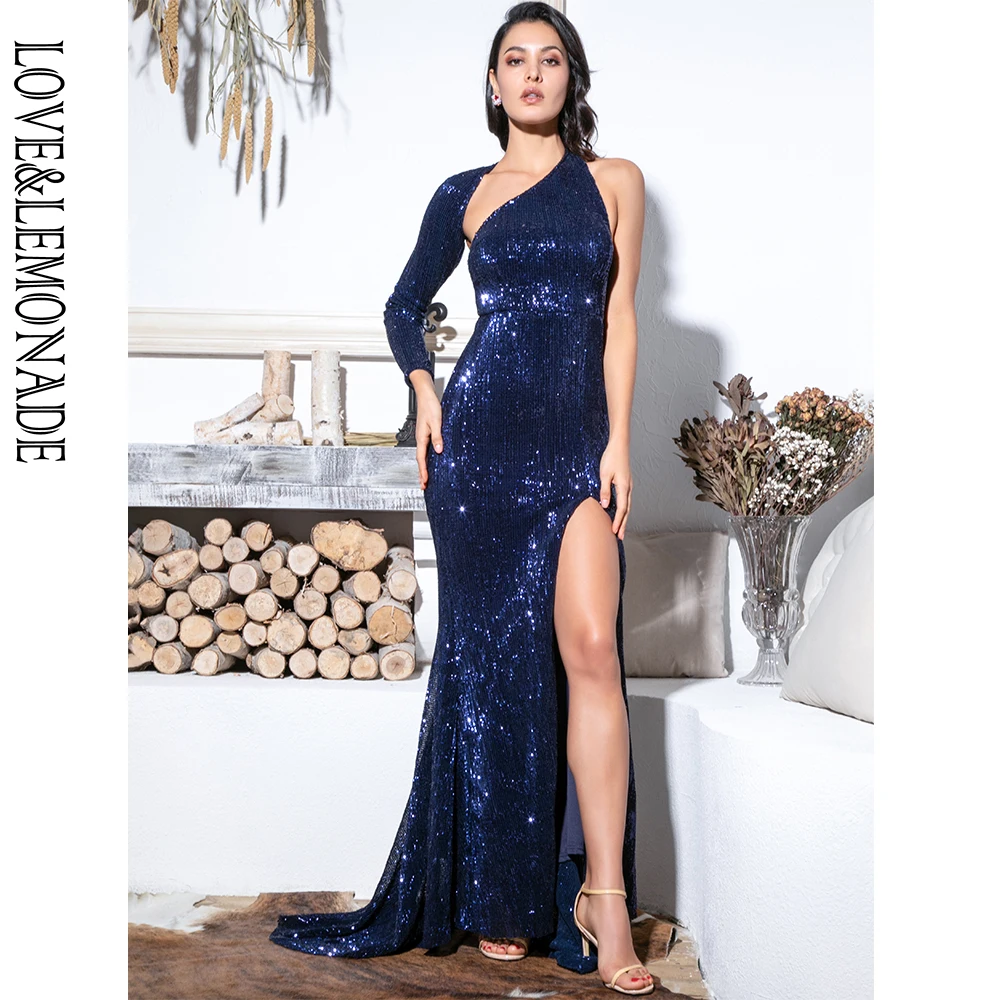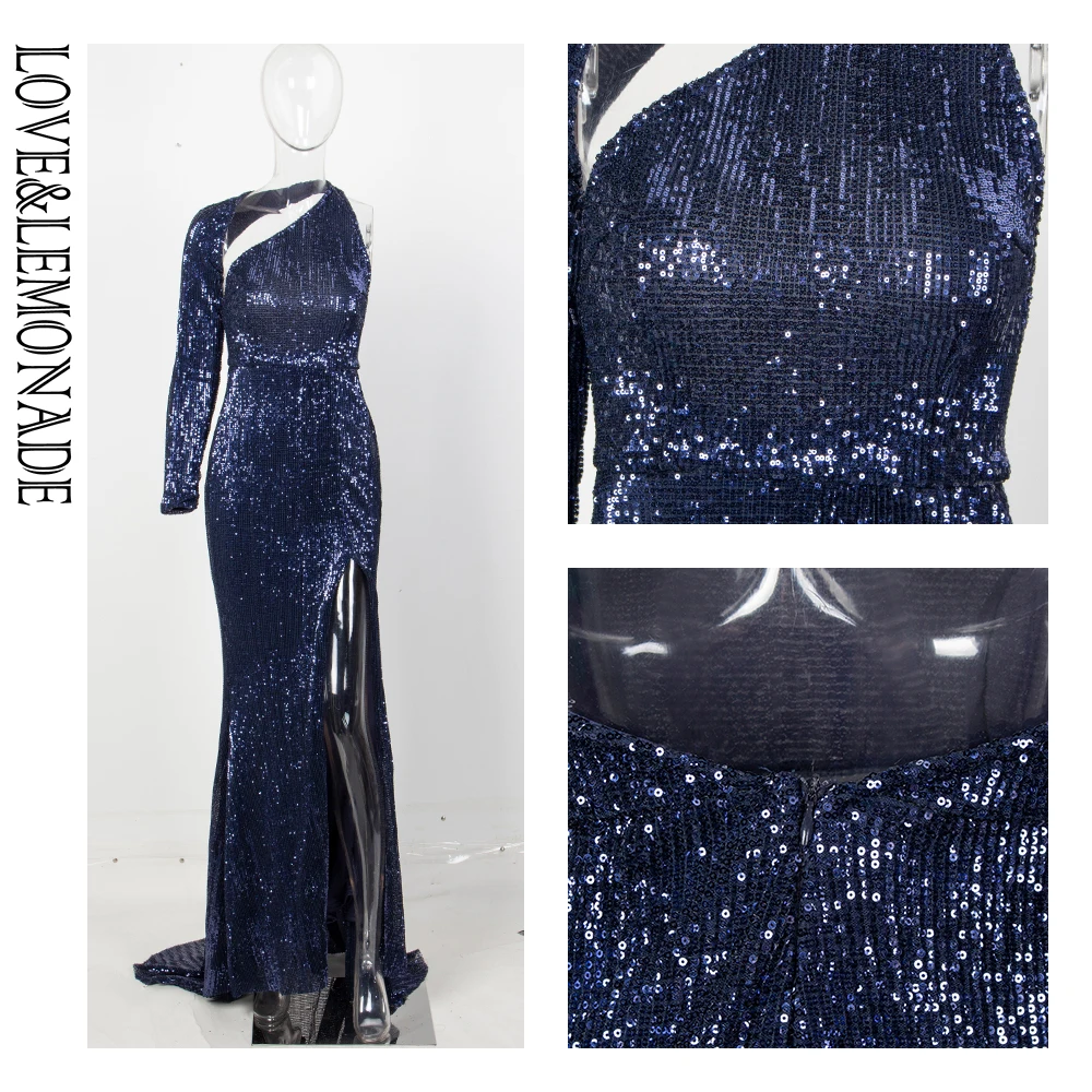 Dark Blue Sequin Dress Open Back Single Sleeve Slim Fit Elastic Long Dress