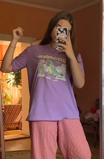T-shirt is good, dense material, the sticker is accumulated, the seams are even, odorless, after washing everything is okay, slightly too big, but my daughter likes. Thank you store.
