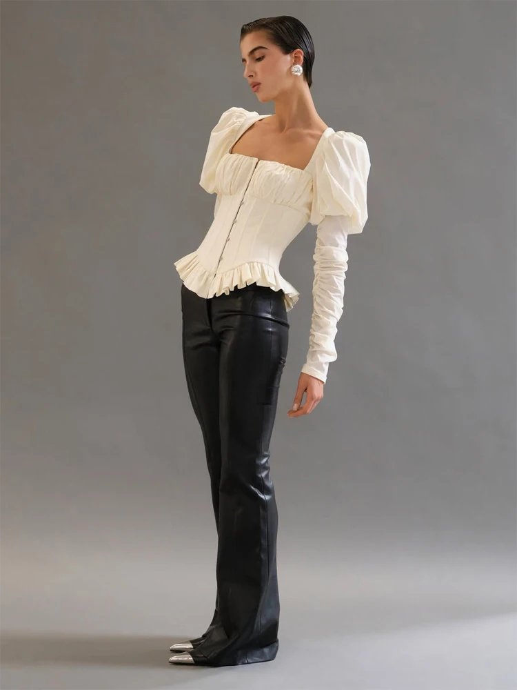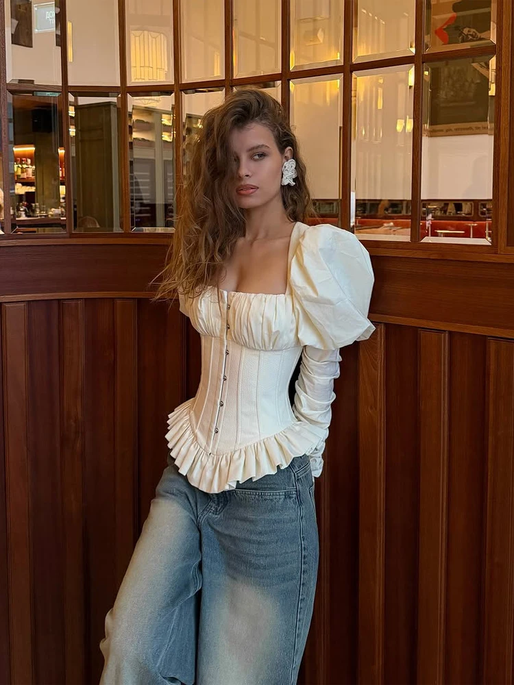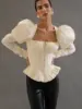 This cream vintage peplum corset top with lace-up back blends romantic tailoring with structured elegance. Designed with a fishbone corset construction, pleated puff sleeves, and a sculpted waistline, it creates a refined hourglass silhouette.