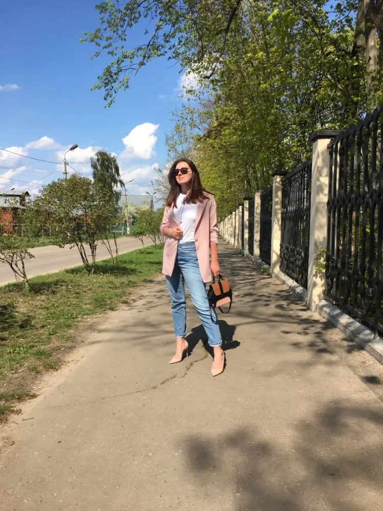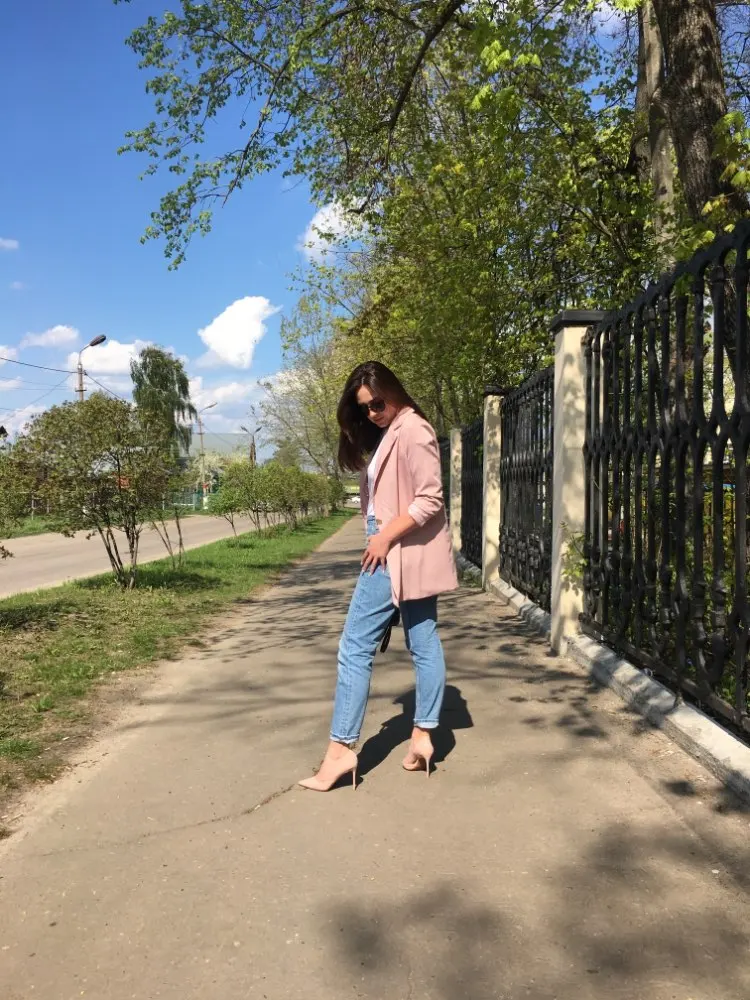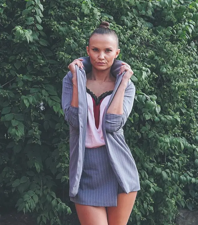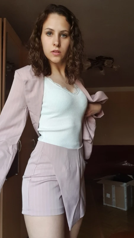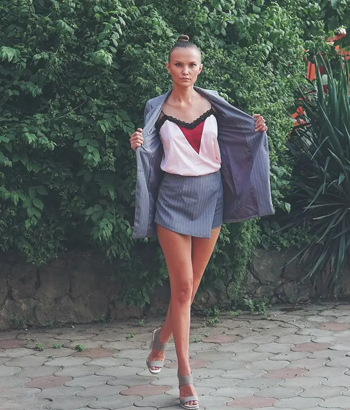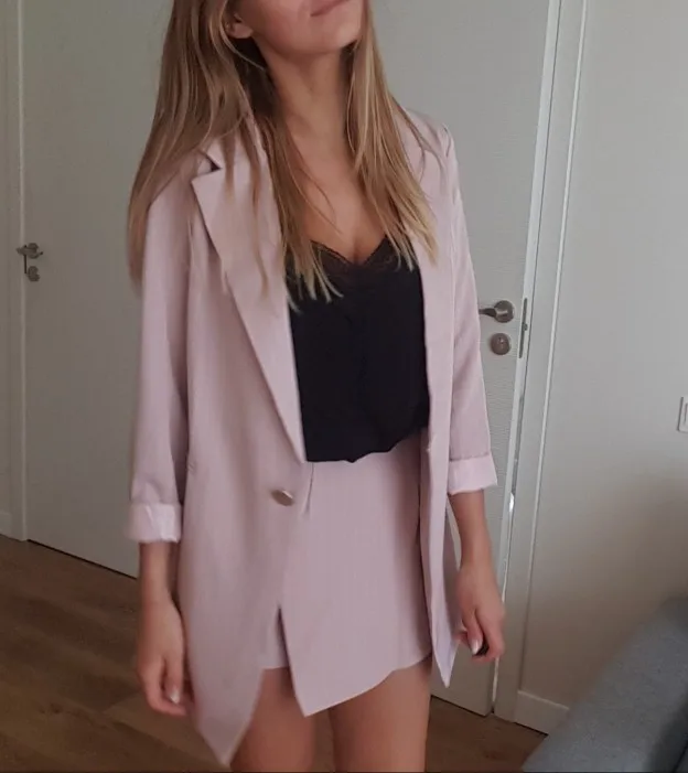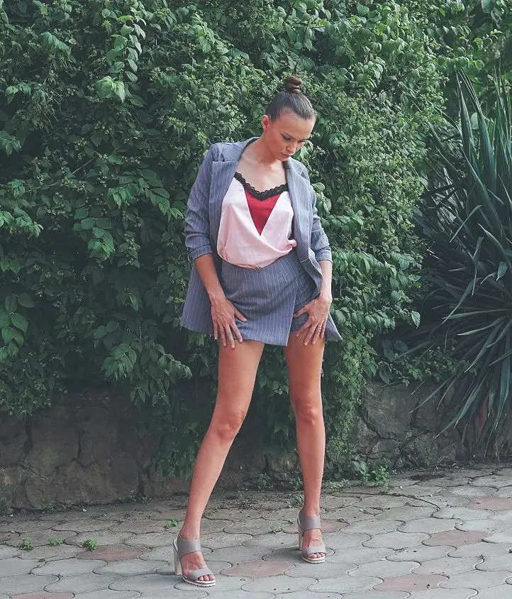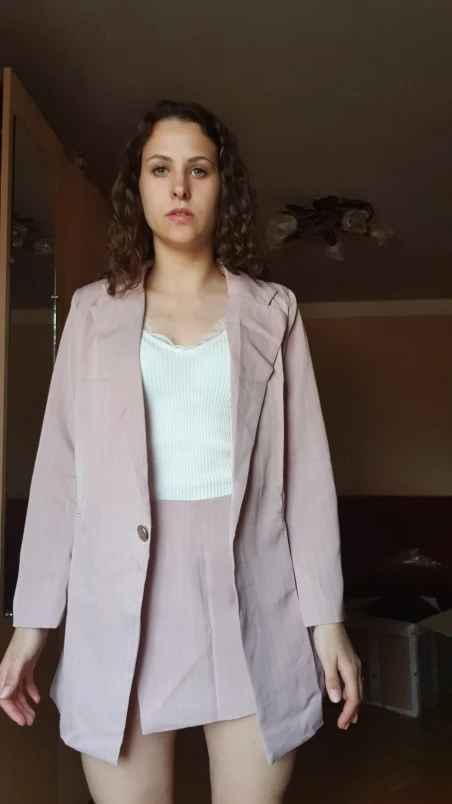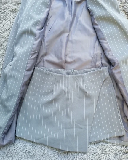 From this store, only cool things came to me both in quality and design. Since i already have a pink suit, i ordered a gray one. The color is interesting, as if a little gives in dusty blue. The costume took in size s on my parameters og 82 cm, from 60 cm, about 89 cm and height 165 cm, the whole village is excellent. The jacket is quite dense and suitable for autumn-spring. Soon i will tell you about another suit and that more summer and light. Fake pockets. There is no tag with the composition. Shorts-skirt in the length of the mini. Spectacular thing. Men are watching. Clasp at the back-a secret zipper in the color of the product. Suit, definitely, # recommend! To the store, too, i advise you to look closely, there are many useful things.