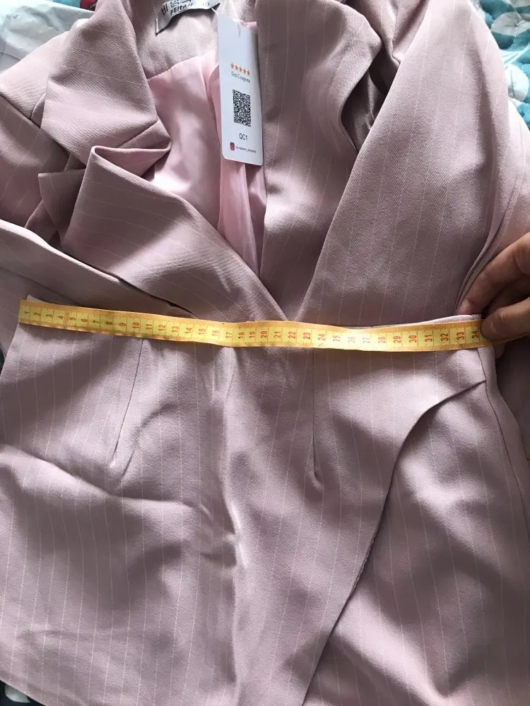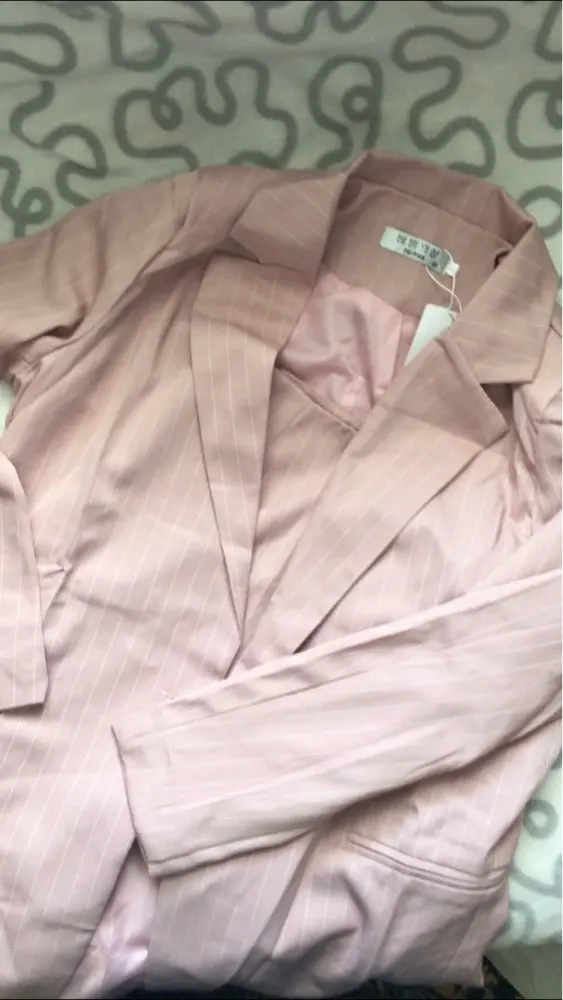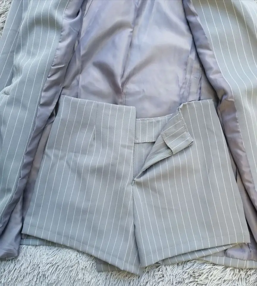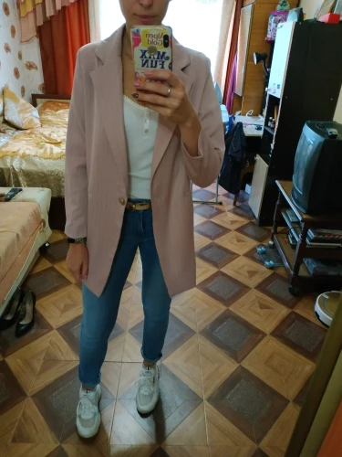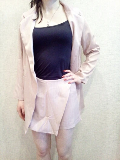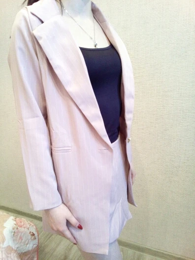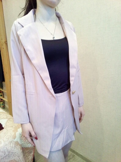 I chose: gray. Size s. The price at the time of purchase: 1619 р. Two-piece suit: an elongated jacket and a short skirt-shorts. Material: coton, polyester, spandex. Thick, good suit fabric in stripes. Turn-down collar, jacket sasteg is on 1 button, i changed it. Shorts are fastened with a zipper. Shorts with a smell. Delivery 2 weeks to russia. Track tracked. Stylish suit, can be worn, with shoes, boots and sneakers. Suitable for any occasion! I recommend to buy and the goods and the store!