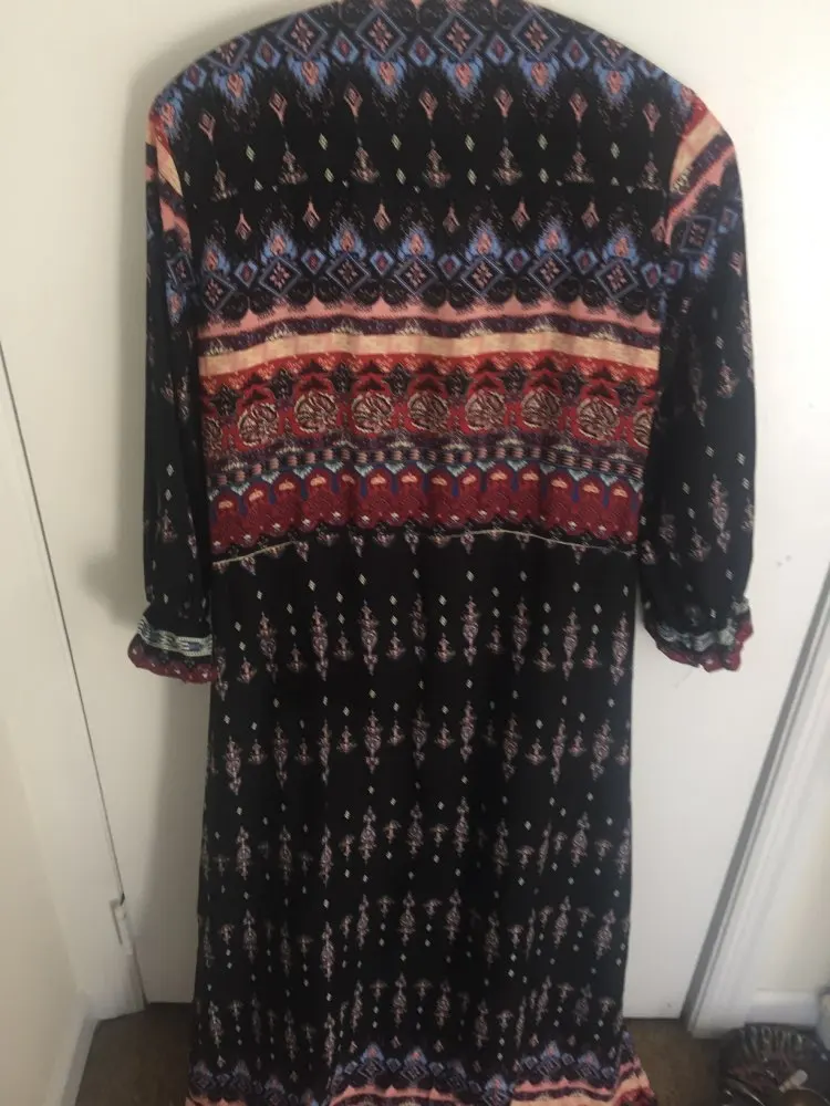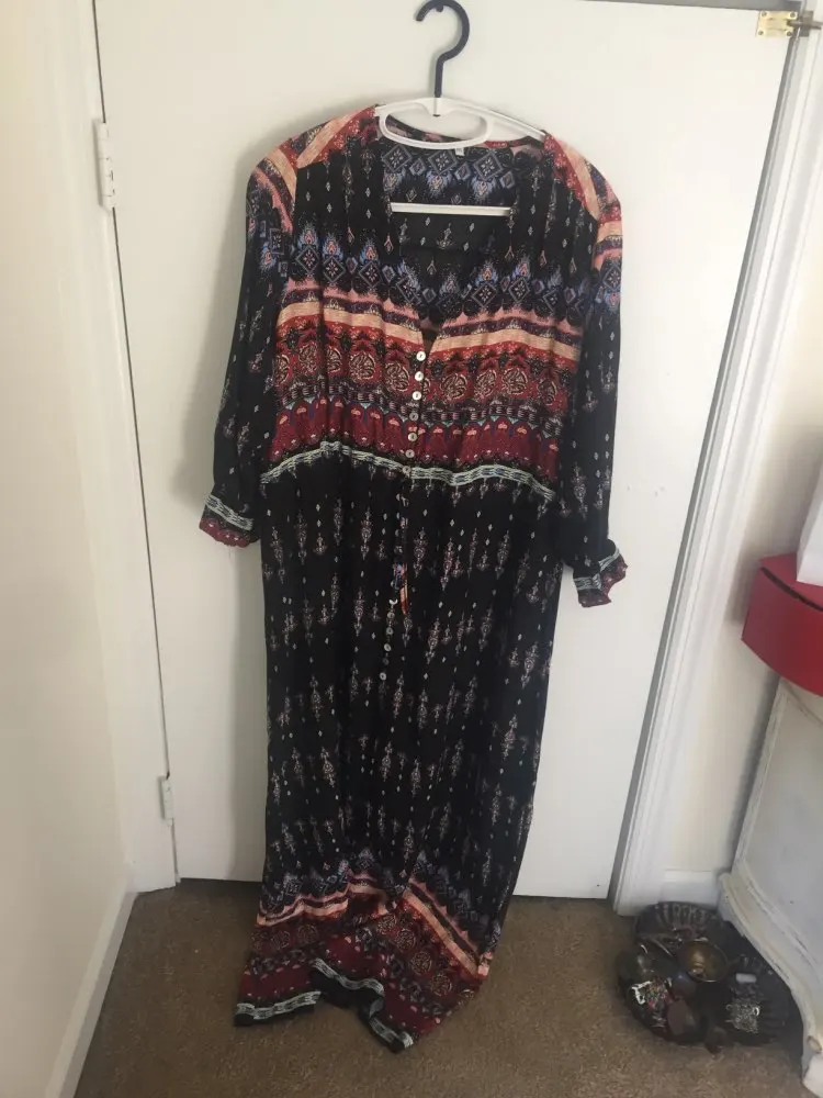 Very nice dress. Fabric is light and flowy it feels like cotton. 2x is a bit thight in chest are. I wish I took 3 x. But great dress overall. Recommending.