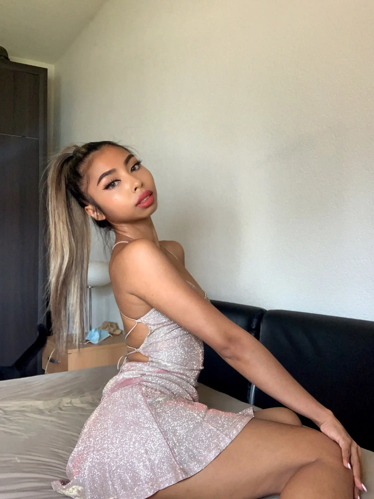 Nice dress. Sits well, lacing on the back allows the product to lie right on the figure. The color is more pink. Of the minuses-on everything you sit on, lie down, what to touch in this dress will remain sequins in countless quantities.