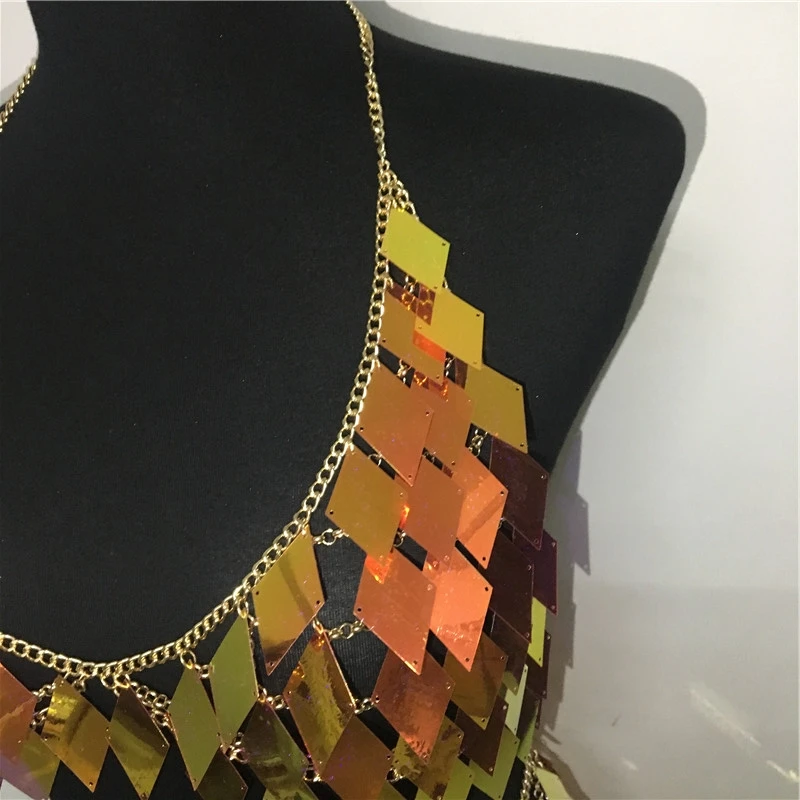 Festival Outfits Glisten Rhombic Sequins Set Metal Chain Crop Tops And Mini Skirt JKP4713