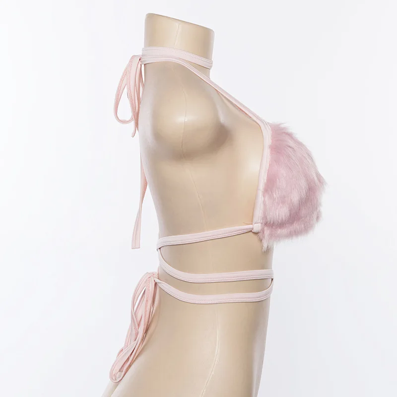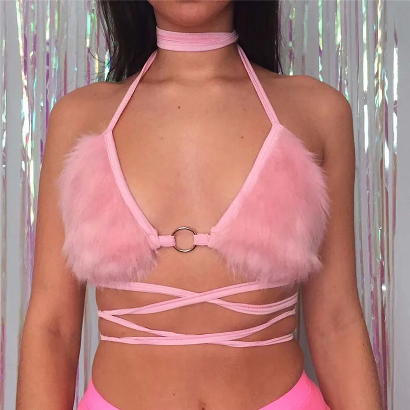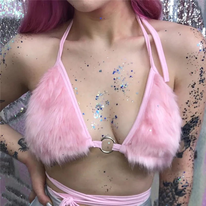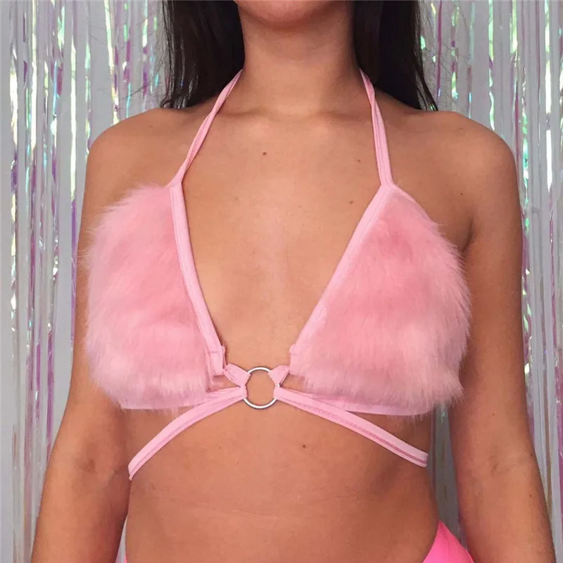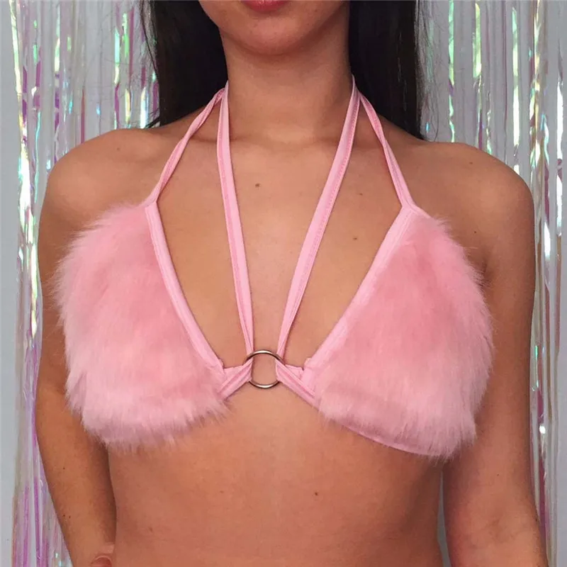 Festival Raves Outfit Pink Fluffy Faux Fur Bra Crop Top JKP4715