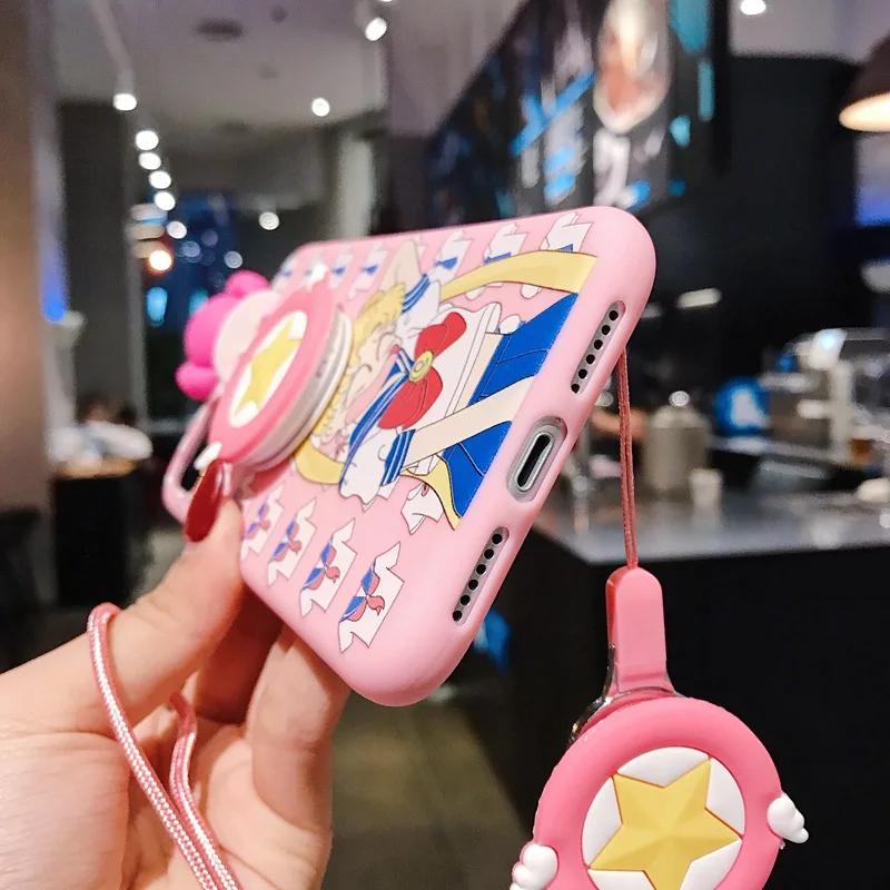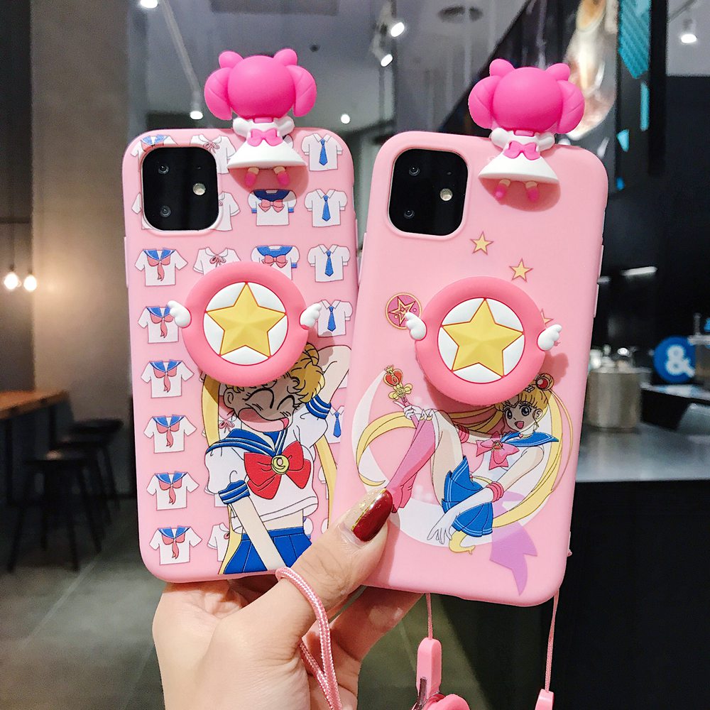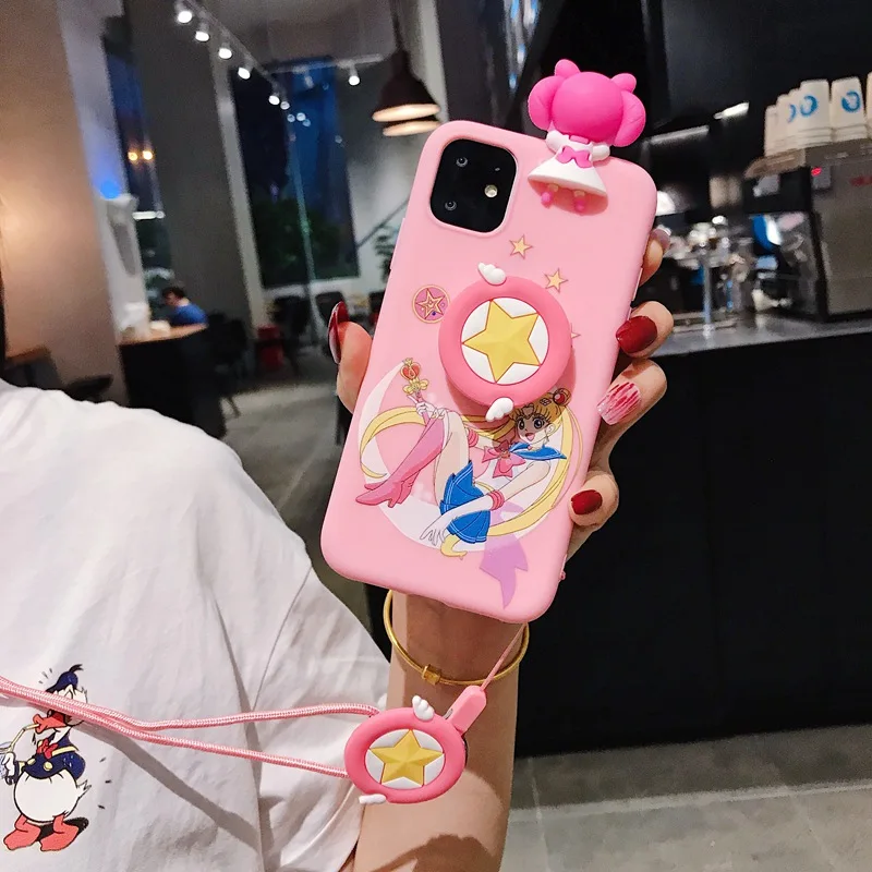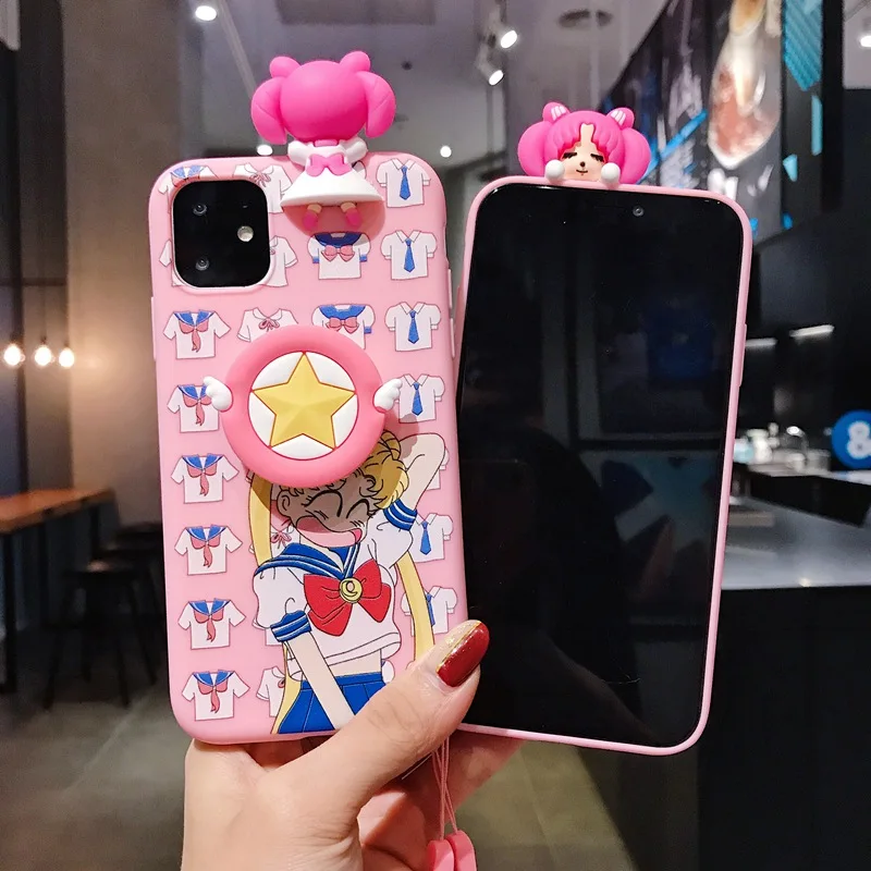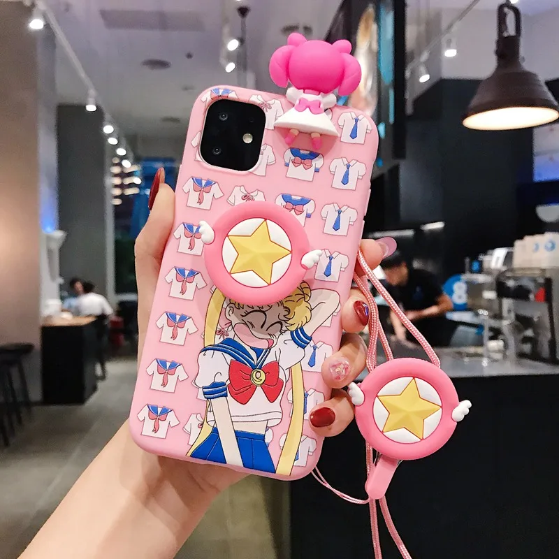 FRE SHIPPING Cute Cartoon Sailor Moon Pink Phone Case For iPhone 11 Pro X 8 7 6s Plus XS Max XR Soft 3D Doll Toys Stand Lanyard Back Cover JKP3745