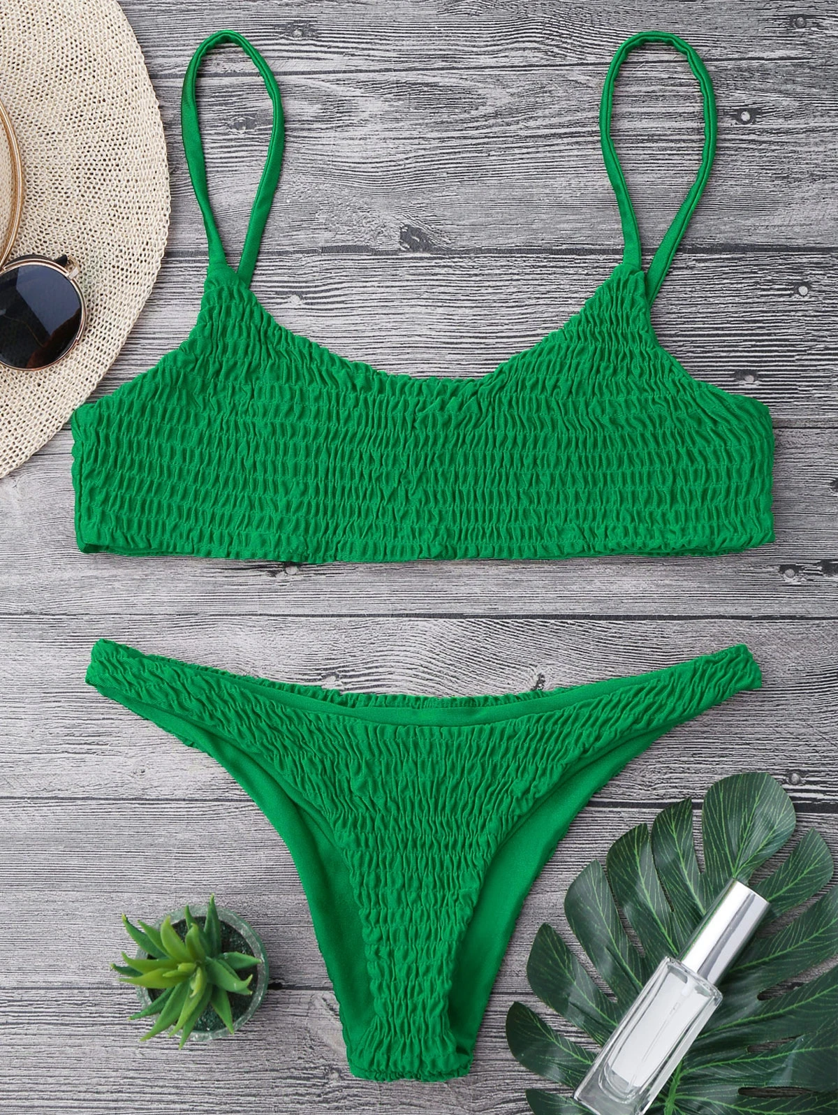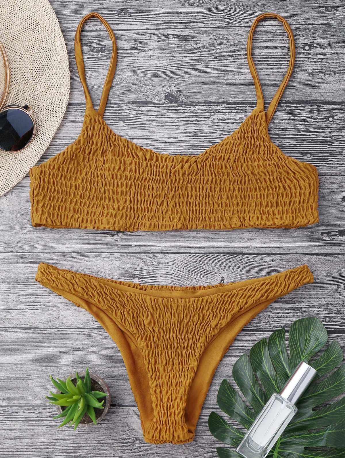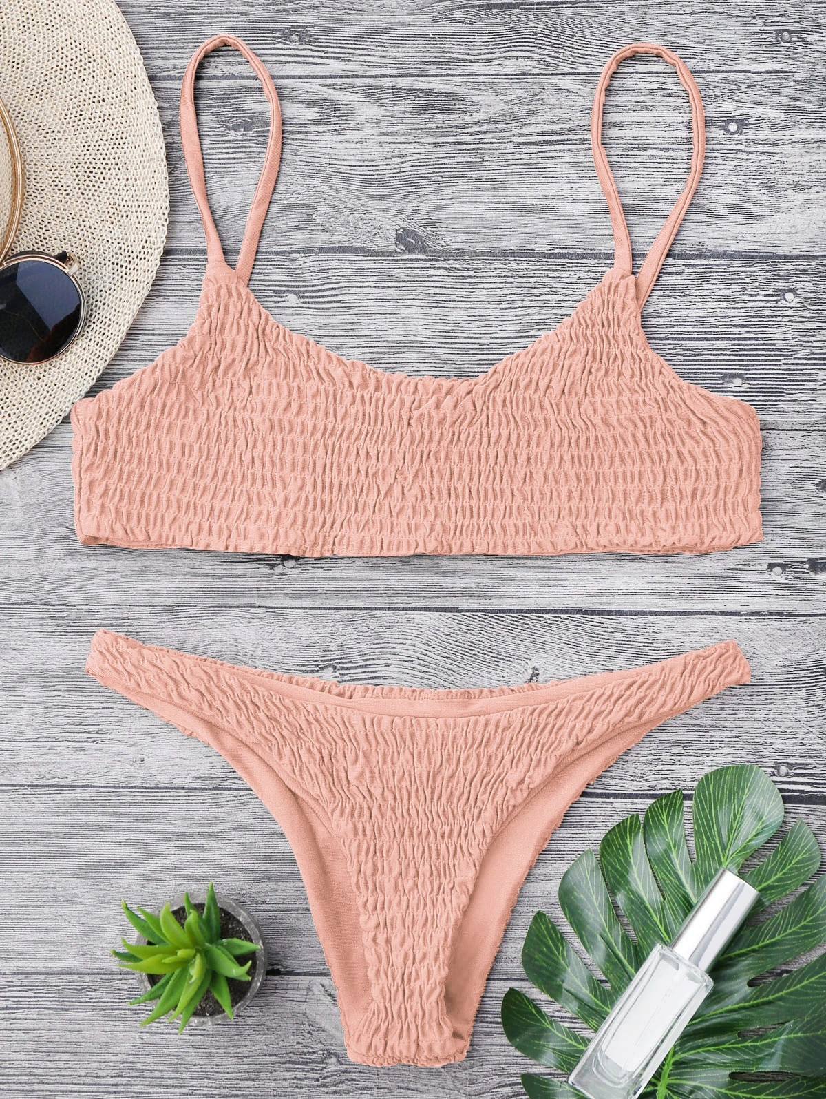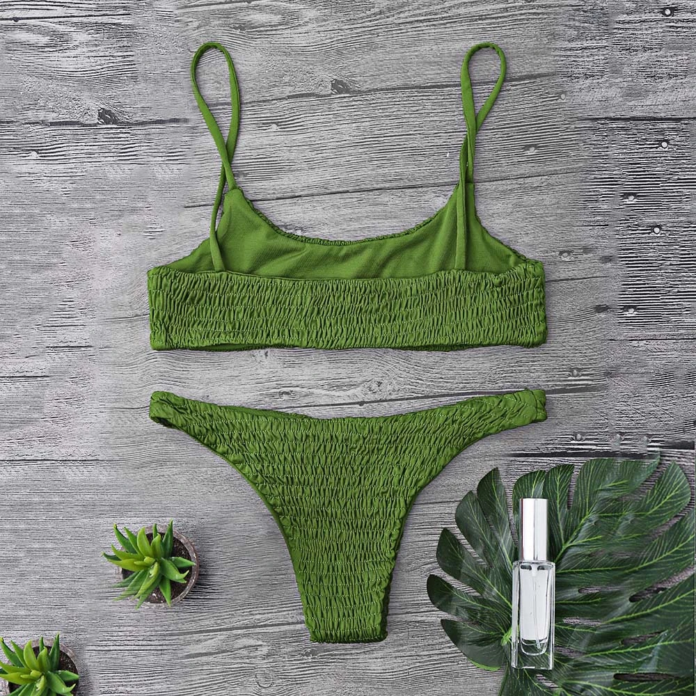 Stretchy smocked bathing suit featuring pullover style cami bralette top and hipster swim bottoms, non-padded.