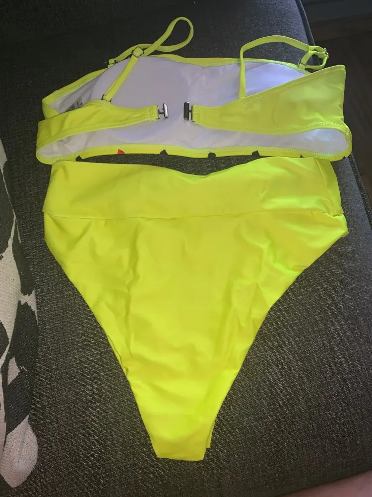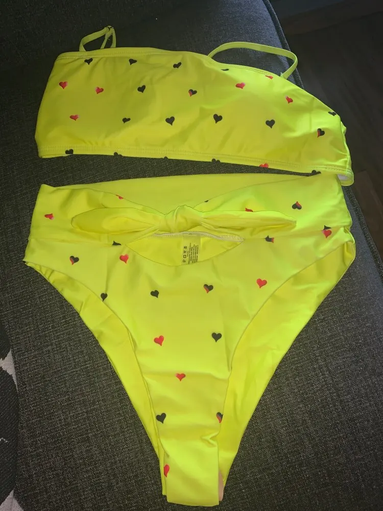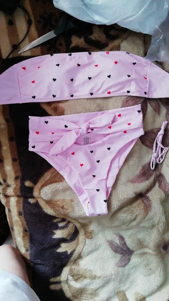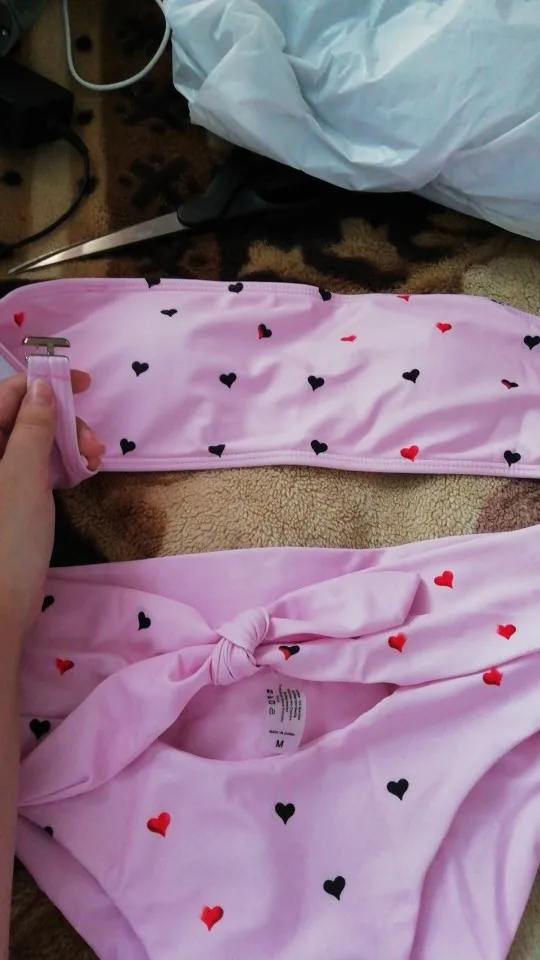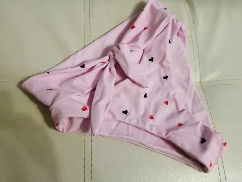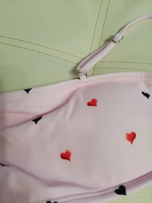 Beautiful bathing suit, the fabric is thick so it will last long, well finished, hearts are beautiful, the design equal to the photo. Size l is correct. Very nice, guaranteed purchase and happy customer