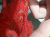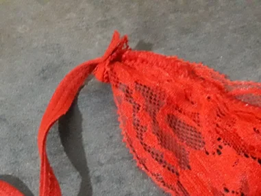 As the picture. Soft lace, But at the bottom of the strap, and not riveted, so a little prickly. Try to trim