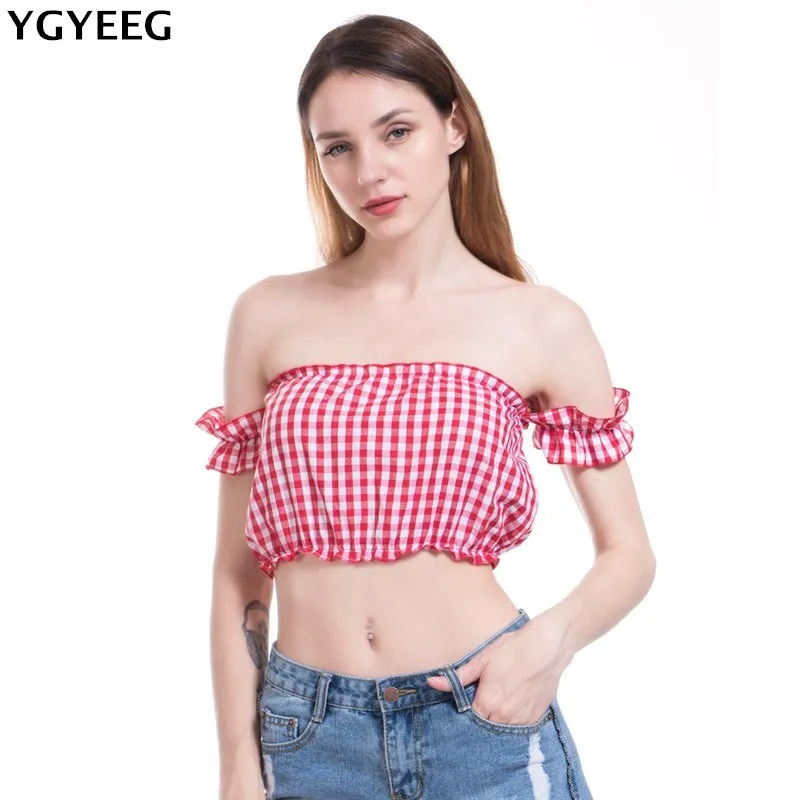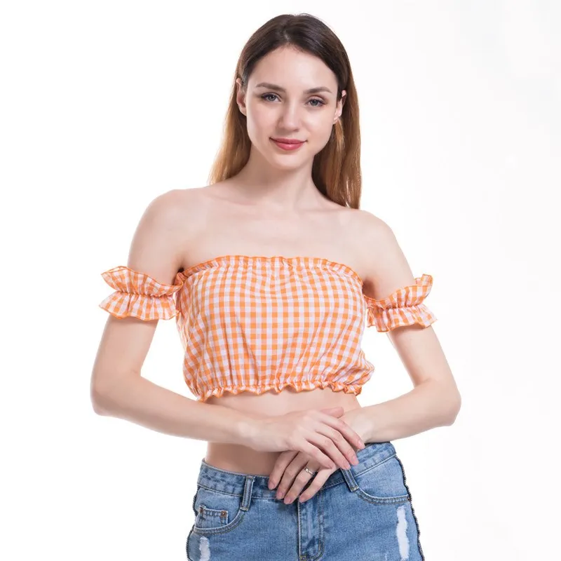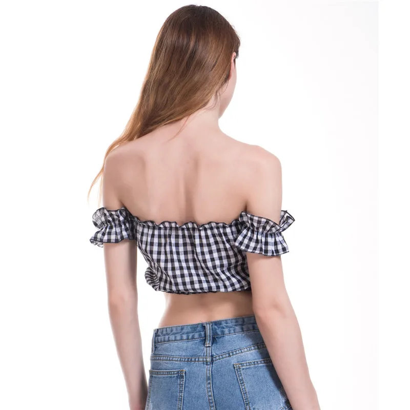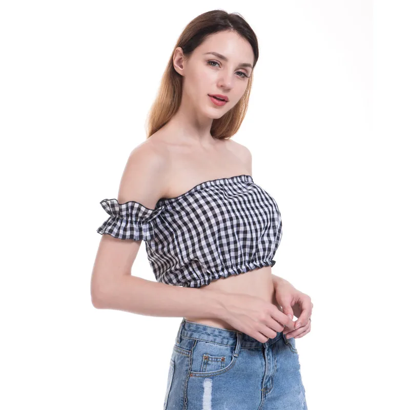 • FREE SHIPPING 2018 Elastic Plaid Ruffles Summer Top1136