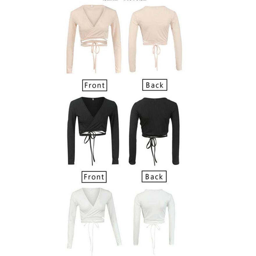 FREE SHIPPING 2019 Long Sleeves T shirt Cross V-neck Wrap Crop Top JKP1422