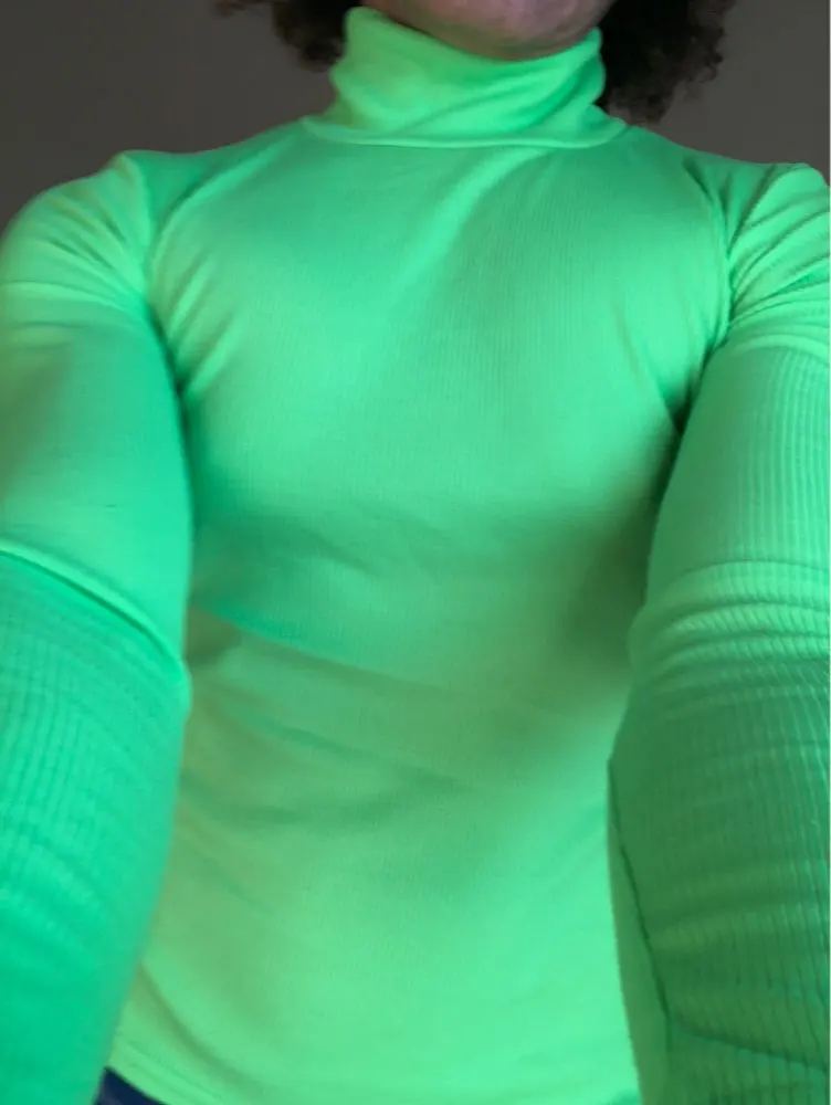 colour is a vibrant neon green (not picking up on camera properly, a lot brighter in real life). sizing wise, i ordered a M even tho i’m normally an XS/S and i say you can order ur normal size. there’s a bit of stretch so it completely depends on ur desired fit. overall happy with it. the material is thin tho so be aware of that.